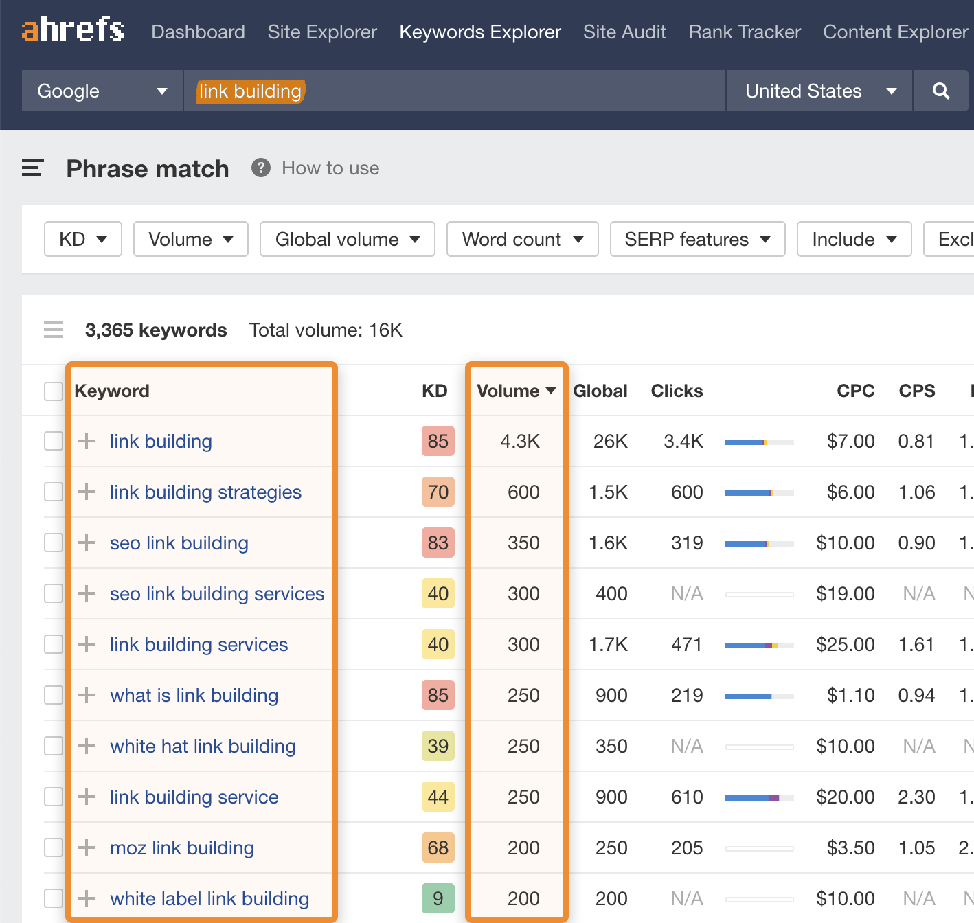 Dato che la parola chiave rappresenta solitamente un argomento, puoi ottenere questo risultato compiendo una buona ricerca di parole chiave con un apposito strumento come il Keyword Explorer di Ahrefs. Cerca un argomento generico e vai poi nel report chiamato Corrispondenza Frase, dove ti verranno proposte delle idee di parole chiave da utilizzare ordinate in base al loro volume di ricerca.