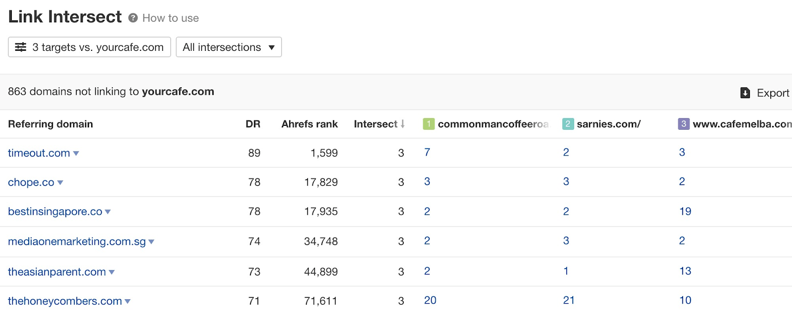 Un altro metodo che puoi usare è lo strumento di Ahrefs chiamato Link Intersect, che ti fa vedere chi menziona la concorrenza ma non la tua azienda. Ecco come fare: