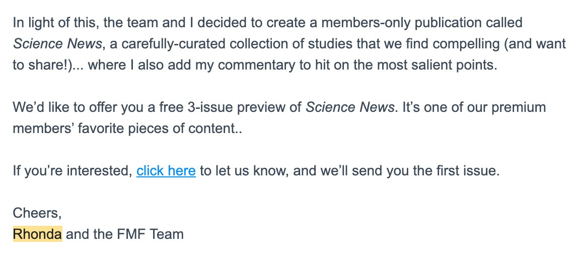 Puoi anche creare una serie di e‑mail spalmate su più giorni, come quelle che Rhonda Patrick invia dopo l’iscrizione alla sua mailing list. Nella sua prima e‑mail offre un valore immediato: un video gratuito e una presentazione solitamente riservata ai membri premium: