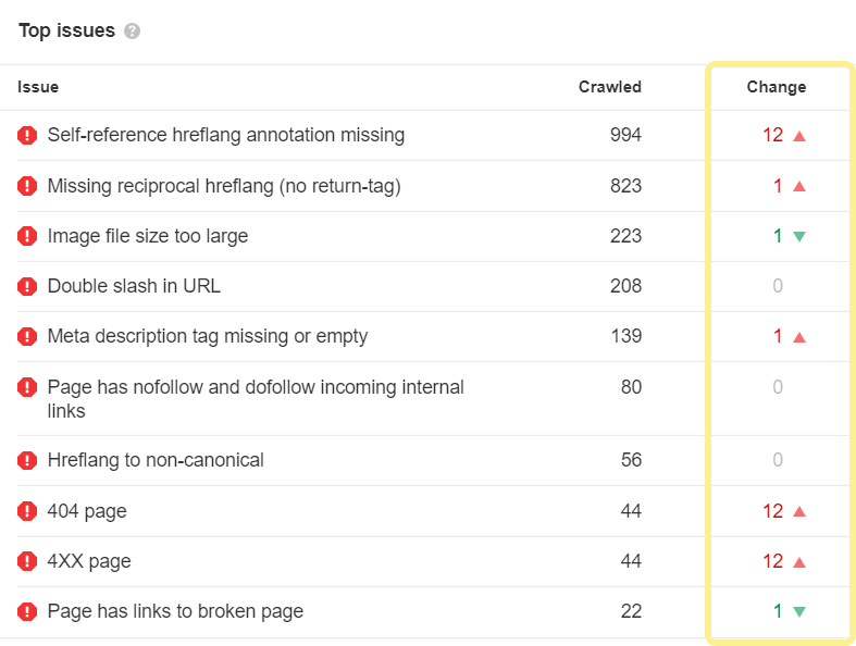 Ci sono diverse opzioni per analizzare i cambiamenti. Come già detto prima, puoi cambiare l’ambito della scansione all’interno del Site Audit per ottenere un confronto e comprendere cosa è cambiato. Quello che devi cercare, sono i cambiamenti correlati ad elementi come: