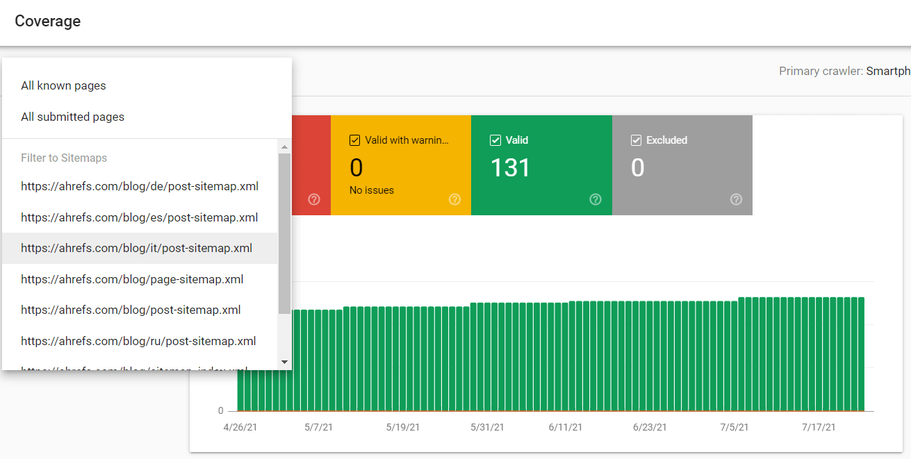Il report “Copertura dell’indice” ti aiuta a vedere in che modo le tue pagine vengono indicizzate. Se hai caricato sia la nuova che la vecchia sitemap, puoi analizzare i cambiamenti a livello di indicizzazione per verificare la presenza di eventuali problemi. Attraverso il caricamento delle sitemap, puoi infatti analizzare il report di copertura specifico delle pagine contenute in quelle sitemap.