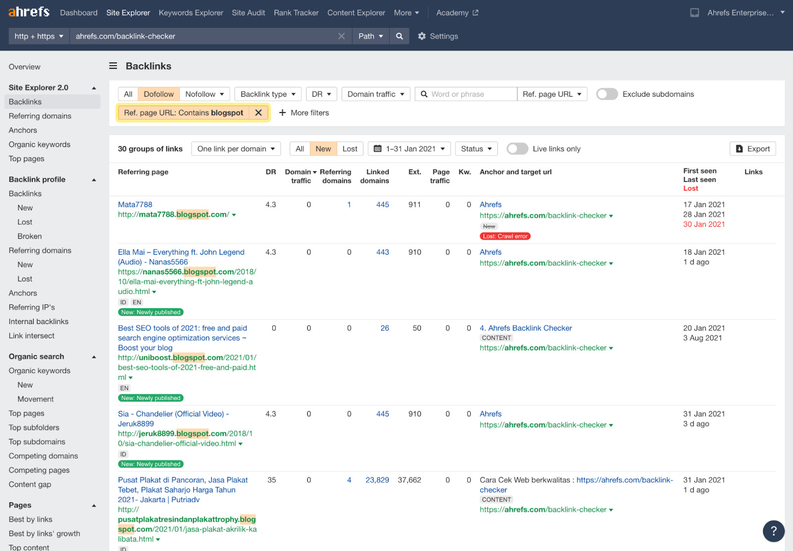 L’immagine qui sopra mostra una distribuzione standard di nuovi domini referral per ahrefs.com. I link dai domini con un DR 0–30 costituiranno sempre la parte più corposa. Alcuni sono spam. È normale, e non c’è nulla di cui preoccuparsi.