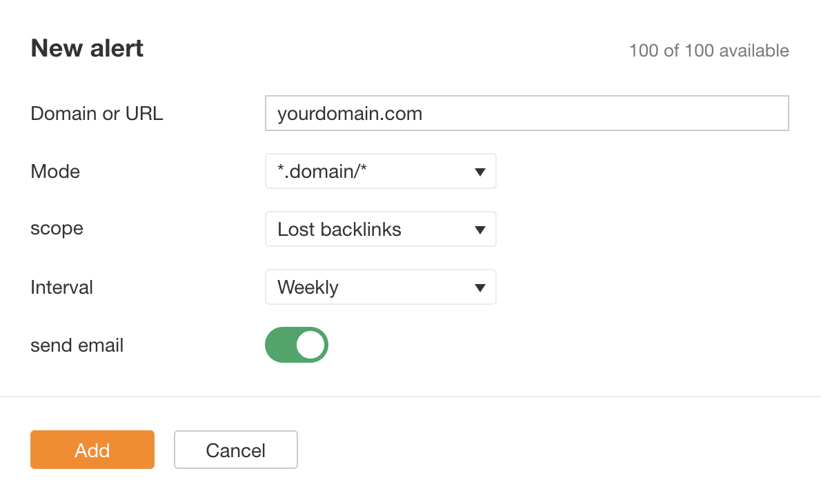 Avvisi > Backlink > Nuovo avviso > Inserisci il dominio > Nuovi backlink > Imposta un intervallo per le email > Aggiungi