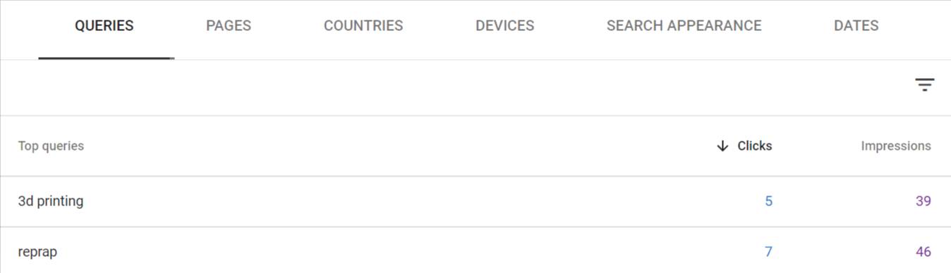 - Top queries si riferisce alle query di ricerca di Google (ad es. parole chiave) che hanno generato impressioni sul tuo sito web. Ciò significa che ogni volta che l’URL del tuo sito viene visualizzato nei risultati di ricerca di Google (può essere ricerca web, ricerca immagini, ricerca video o Google News), la parola chiave che ha generato quell’impressione verrà segnalata qui;