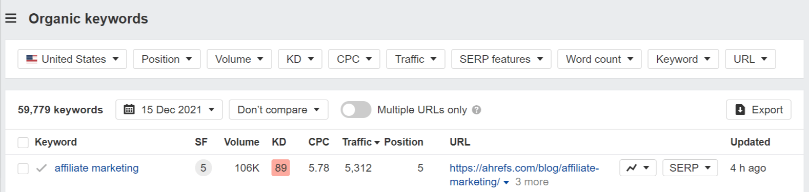 Quando ciò accade, è un segno che devi creare nuovi contenuti ottimizzati per quella parola chiave “non intenzionale”. In tal caso, potresti ottenere più traffico di quello che ricevi attualmente. E più basso è il KD, più facile è creare contenuti che si posizioneranno in alto.