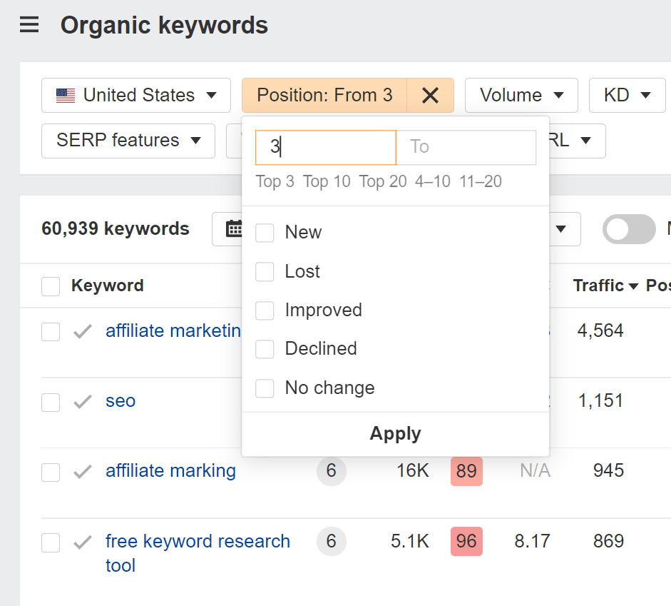 Per trovare le tue parole chiave con prestazioni insufficienti utilizzando Ahrefs Webmaster Tools, accedi al tuo rapporto sulle Parole Chiave Organiche facendo clic sul widget “Parole chiave organiche” nella panoramica del progetto. Una volta nel rapporto, imposta il Paese per cui desideri visualizzare i dati e imposta il filtro Posizione su “3”.