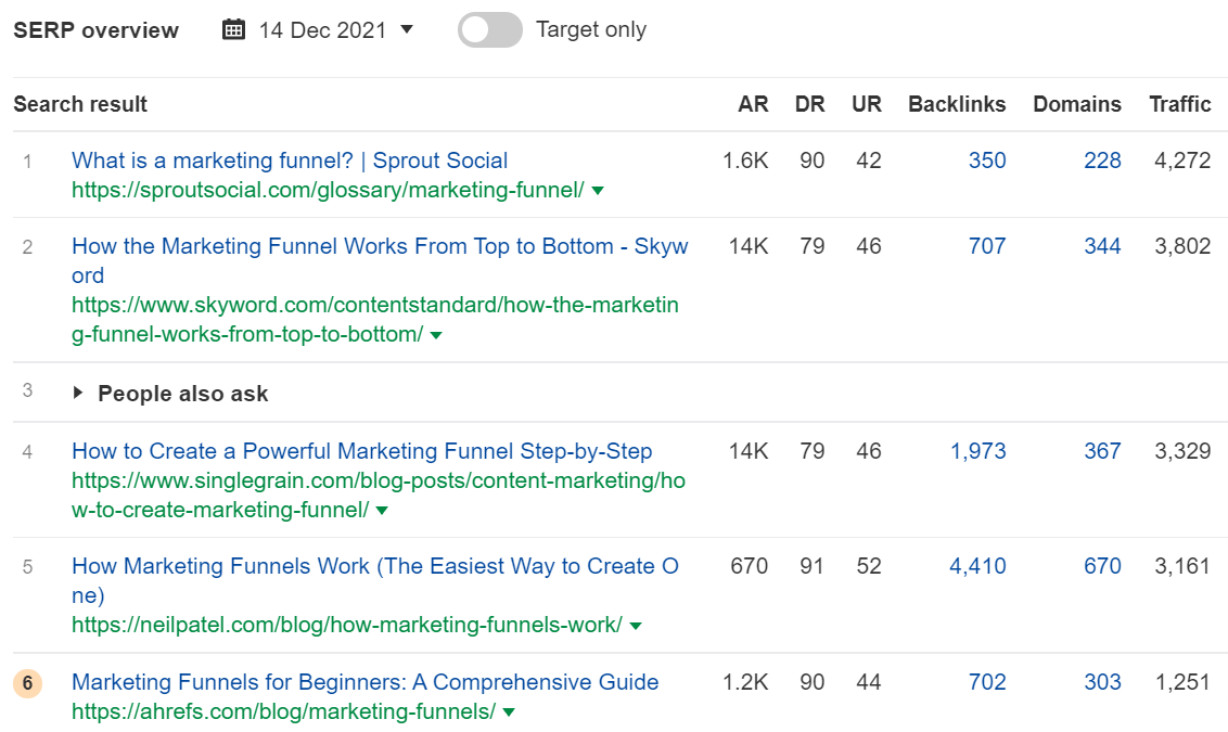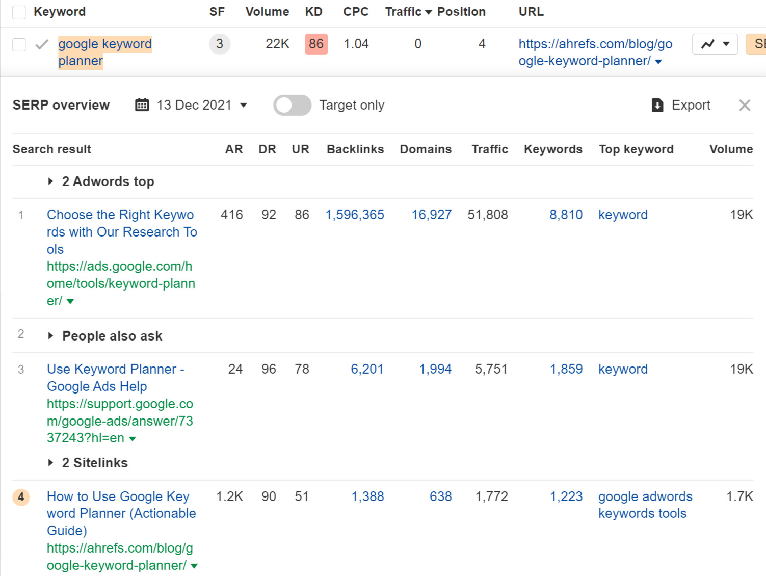 Ora puoi dare un’occhiata a quell’elenco per creare una lista di pagine da ottimizzare. Una buona pratica è usare lo strumento SERP per vedere chi si posiziona sopra di te nei risultati. In questo modo, puoi valutare la probabilità di superarli. Per chiarire questo punto ti basta sapere che noi abbiamo poche possibilità di superare Google per la parola chiave “Google keyword planner”.