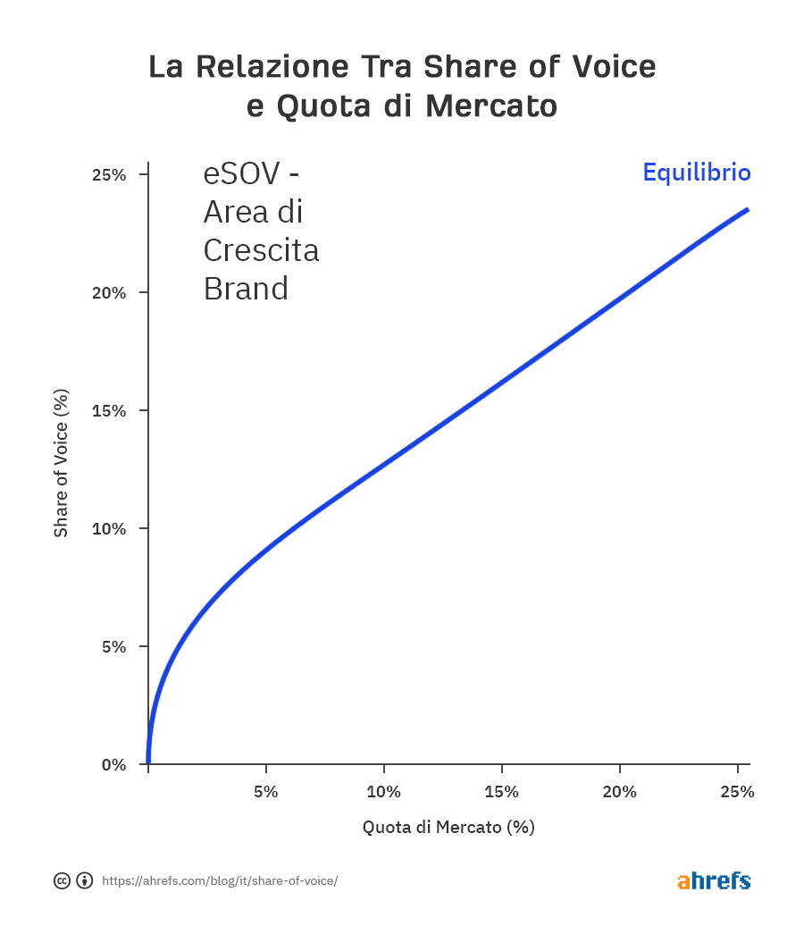 Questo rappresenta un obiettivo di marketing eccellente, in quanto esiste una relazione molto forte fra SOV e market share. Una volta che la tua SOV è maggiore della tua market share, puoi creare ciò che viene chiamato eccesso di SOV (eSOV). Questo significa che, nel lungo termine, la tua market share andrà nella stessa direzione.