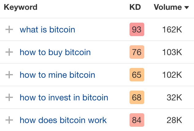 Supponiamo che hai appena lanciato un blog sulle criptovalute. Esistono molte parole chiave popolari con volumi di ricerca elevati che potrebbero potenzialmente generare enormi volumi di traffico per il tuo blog:
