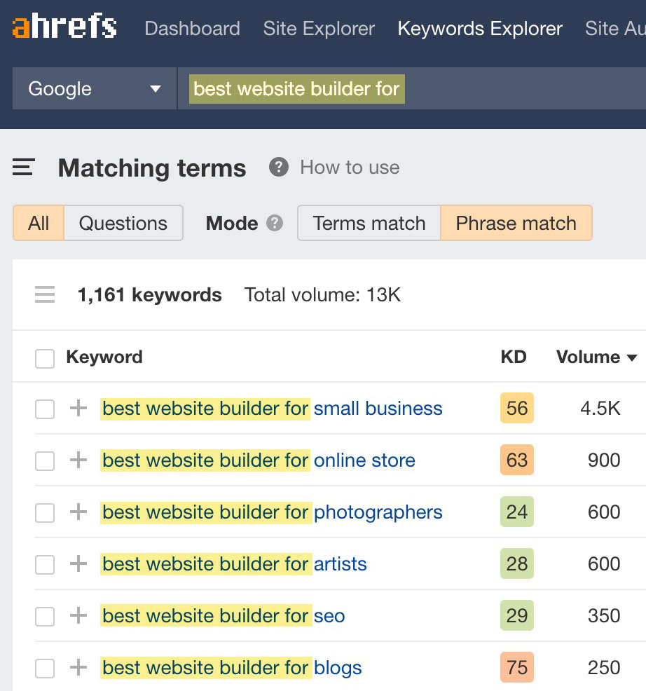 Torniamo all’esempio “miglior software per siti di…” (in inglese). Utilizzando lo strumento Keywords Explorer di Ahrefs ci rendiamo conto che la quantità di parole chiave a coda lunga è enorme: