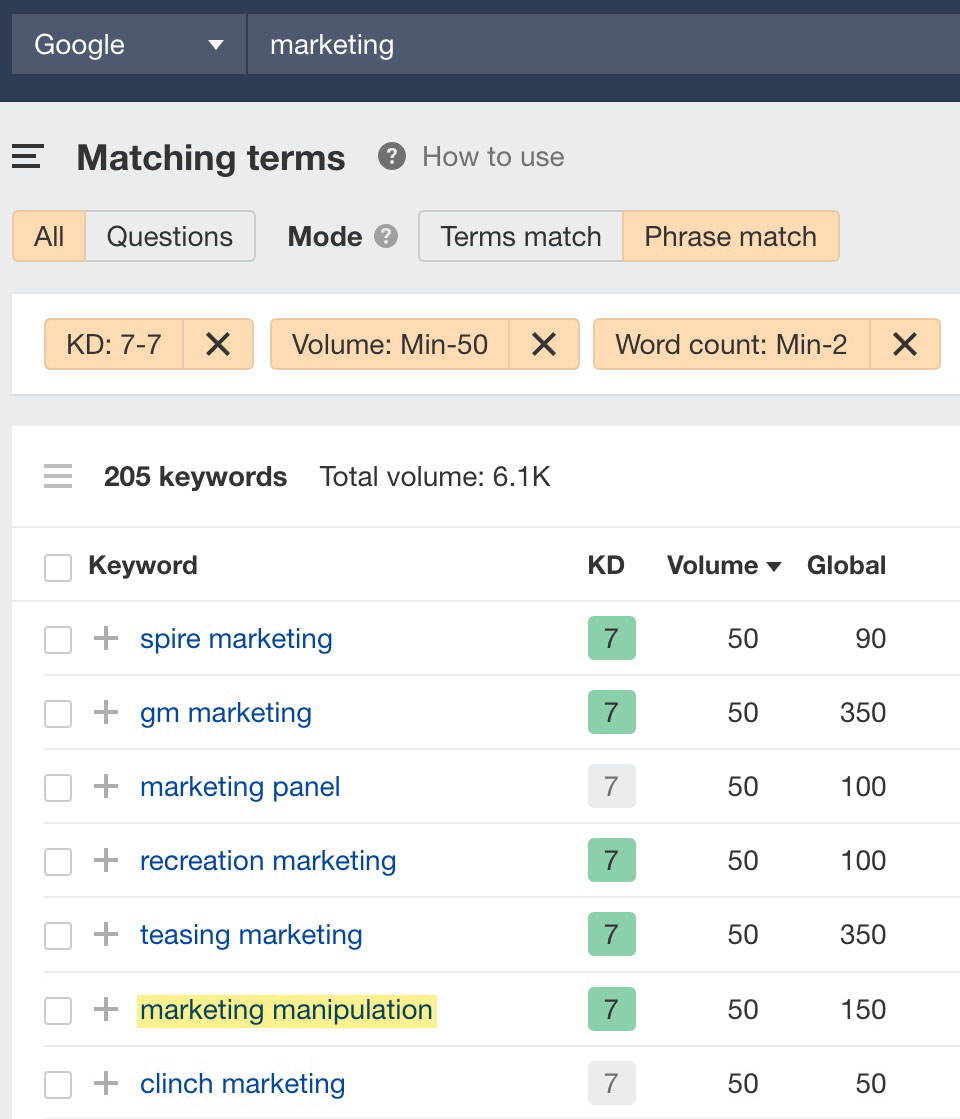 Un velocissimo controllo sul Keywords Explorer mi ha mostrato che la parola “marketing manipulation” è una parola chiave a coda lunga con un punteggio KD basso.