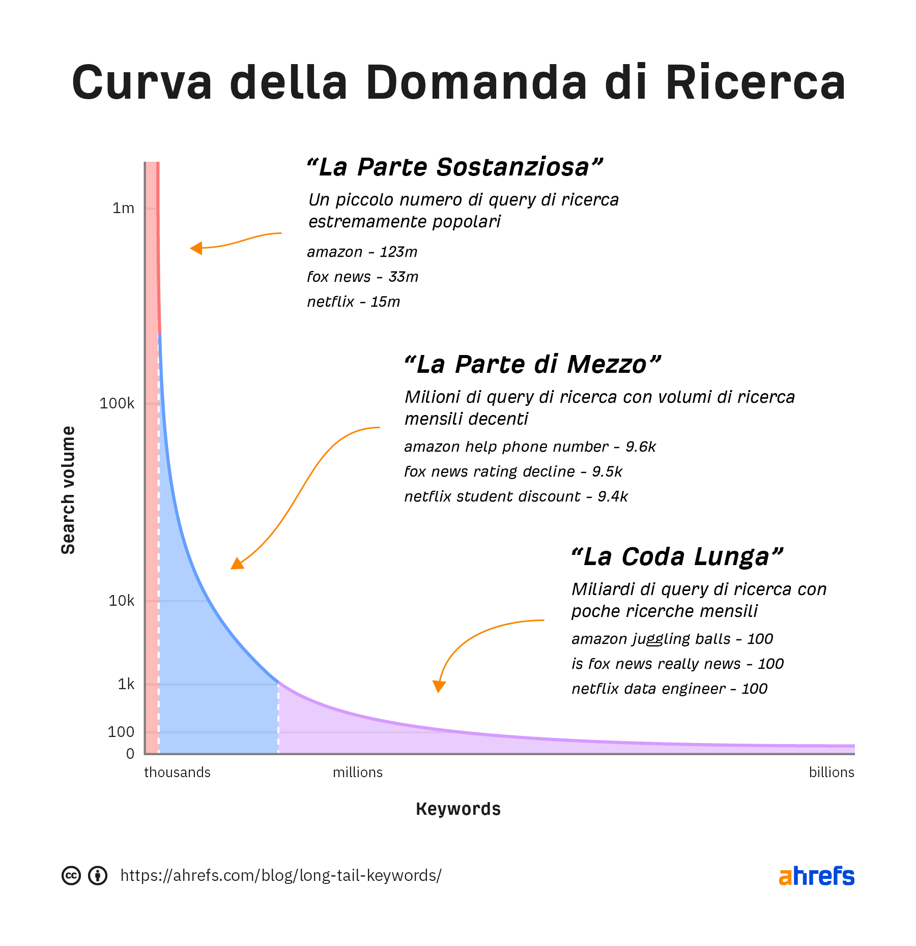 Le parole chiave a coda lunga devono il loro nome dalla loro posizione sulla curva della “domanda di ricerca”. Se tracciamo tutte le query di ricerca che le persone eseguono su Google nel corso di un mese e le ordiniamo in base ai loro volumi di ricerca, ci ritroveremo qualcosa del genere: