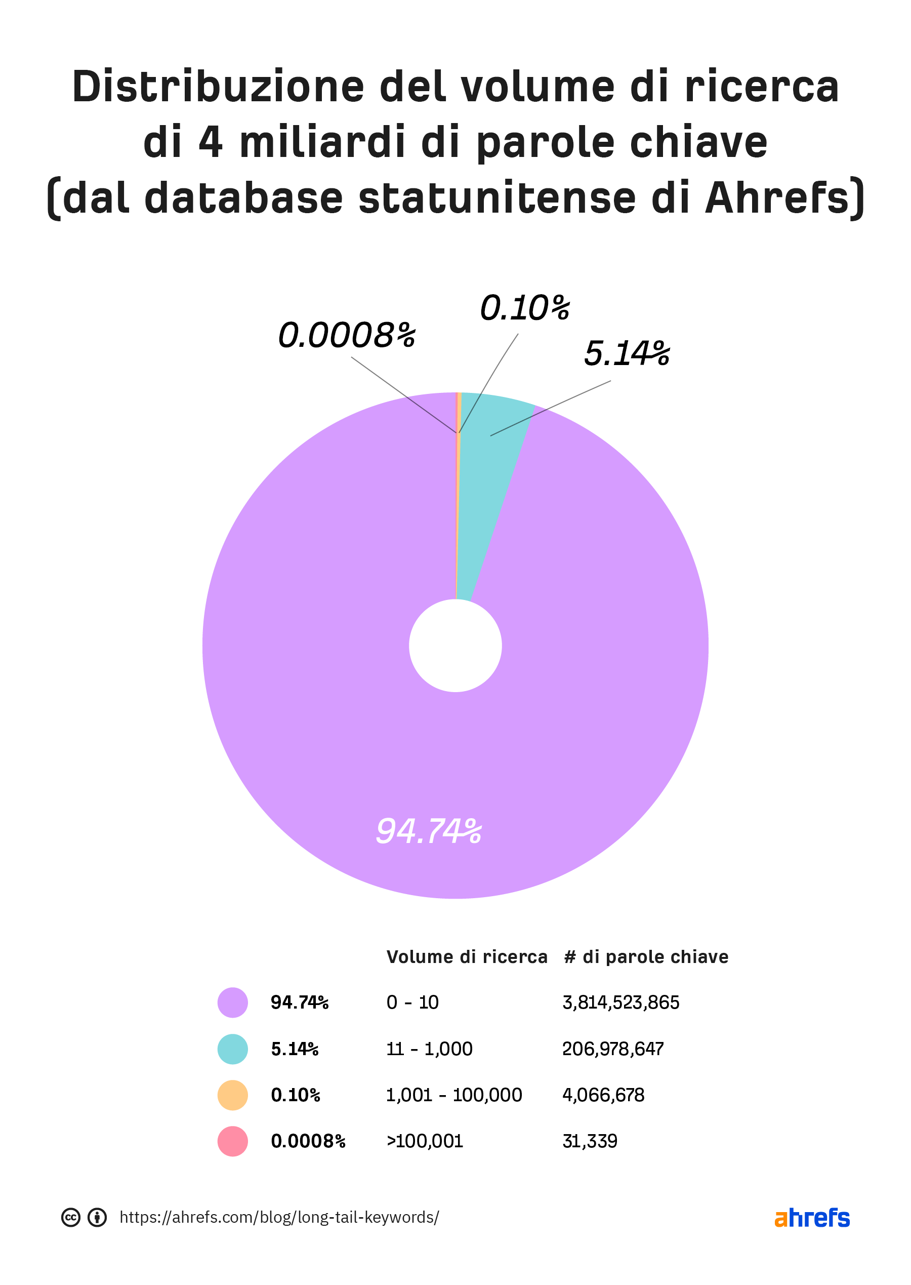 Per essere precisi, nel database statunitense di Ahrefs (che è il più grande del settore!), ci sono solo 31.000 parole chiave con volumi di ricerca pari ad oltre 100.000 ricerche al mese; ci sono invece 3,8 miliardi di parole chiave che hanno meno di 10 ricerche al mese.