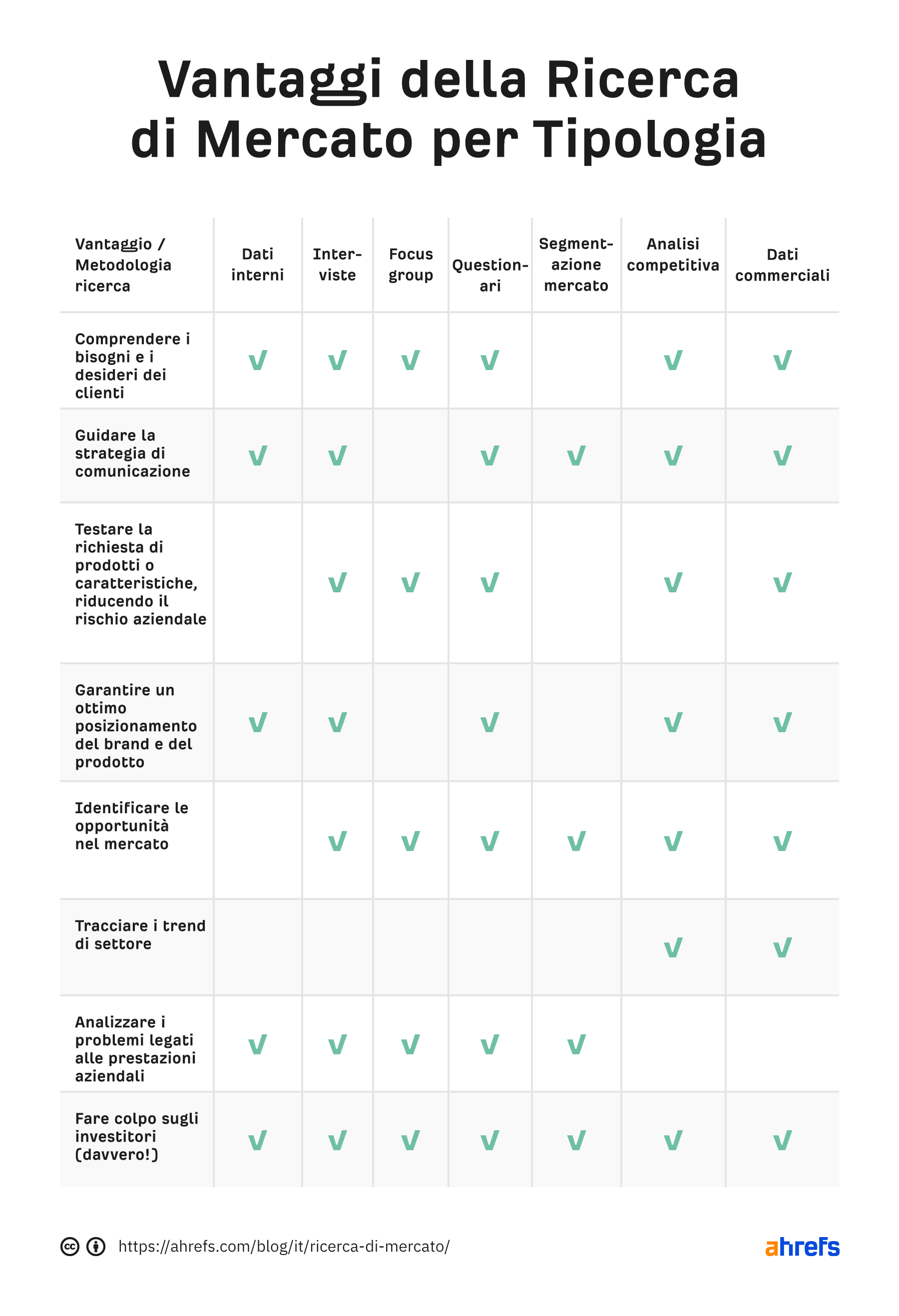 Condurre una ricerca di mercato non è semplice. Se ti senti intimidito, non sei solo. Ma non cambiare idea. I benefici del condurre un’analisi di mercato anche sporadica per la tua azienda non possono essere ignorati. Non diventerai un professionista delle ricerche di mercato in una notte, ma la buona notizia è che non devi farlo. Puoi sfruttare il metodo Agile (come facciamo noi di Ahrefs), utilizzare servizi e strumenti self-service economici online o puoi addirittura esternalizzare la ricerca. Se basi il tuo piano di marketing su dati reali e validati, migliori drammaticamente le tue possibilità di successo.