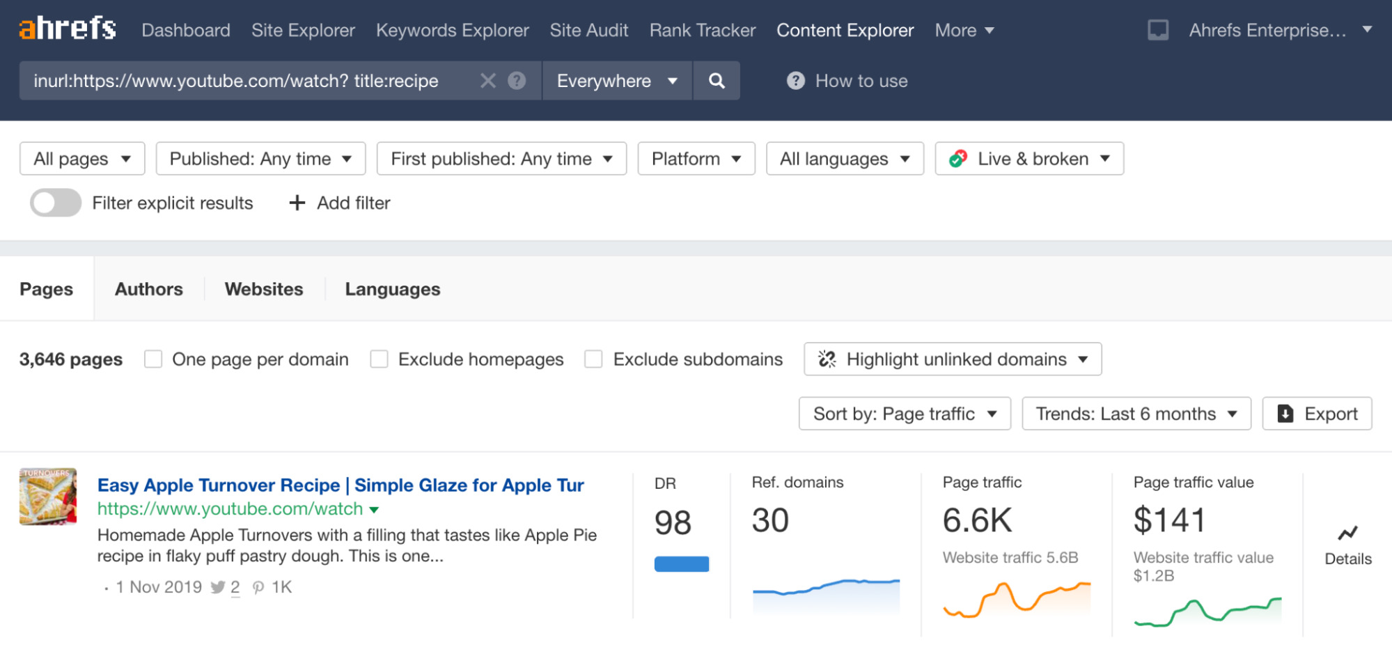 Ad esempio, questo video che mostra come fare un dolce alle mele, ottiene una stima di 6.600 visite mensili da Google secondo il Content Explorer di Ahrefs: