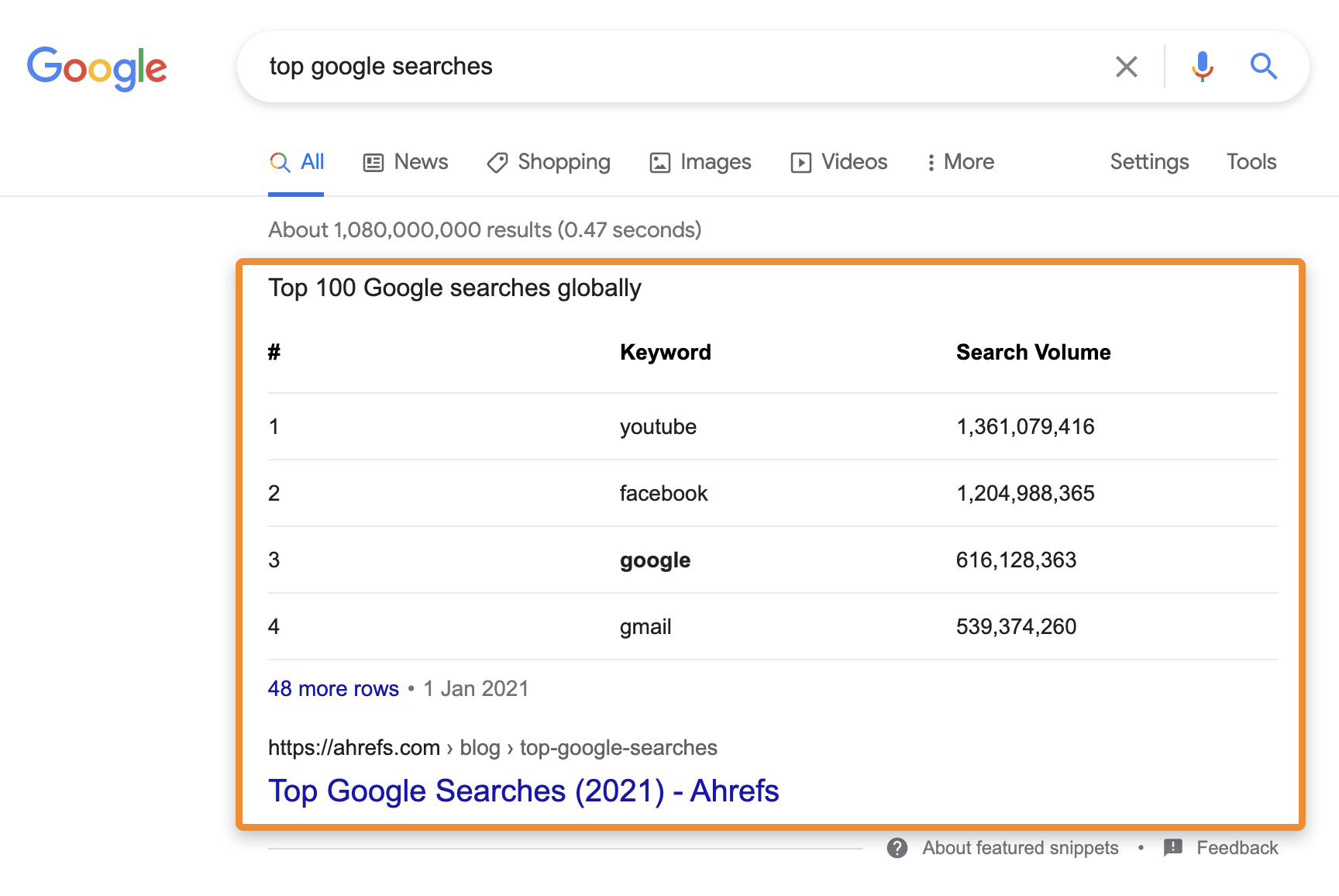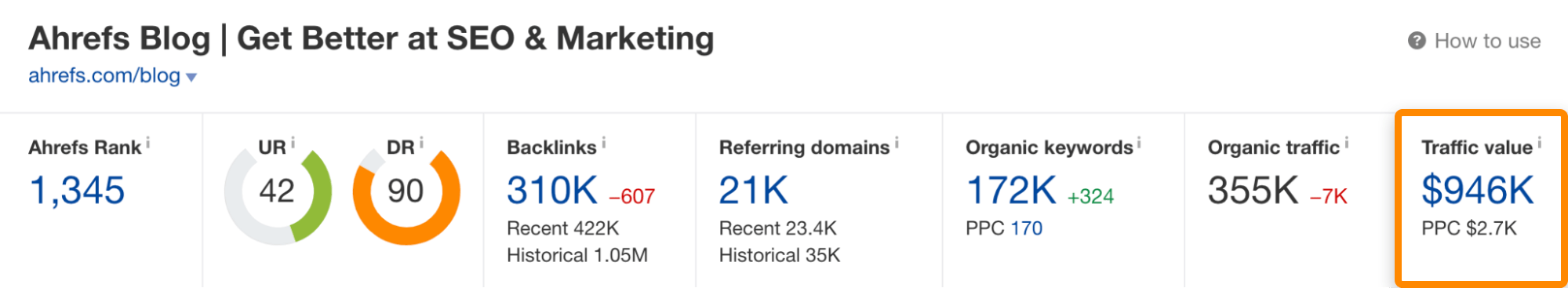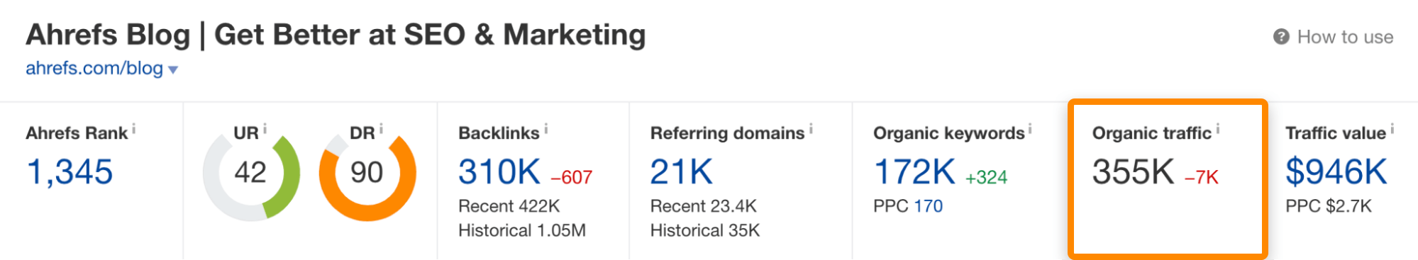Ad esempio, il blog di Ahrefs riceve una stima di 355.000 visite mensili dalla ricerca organica:
