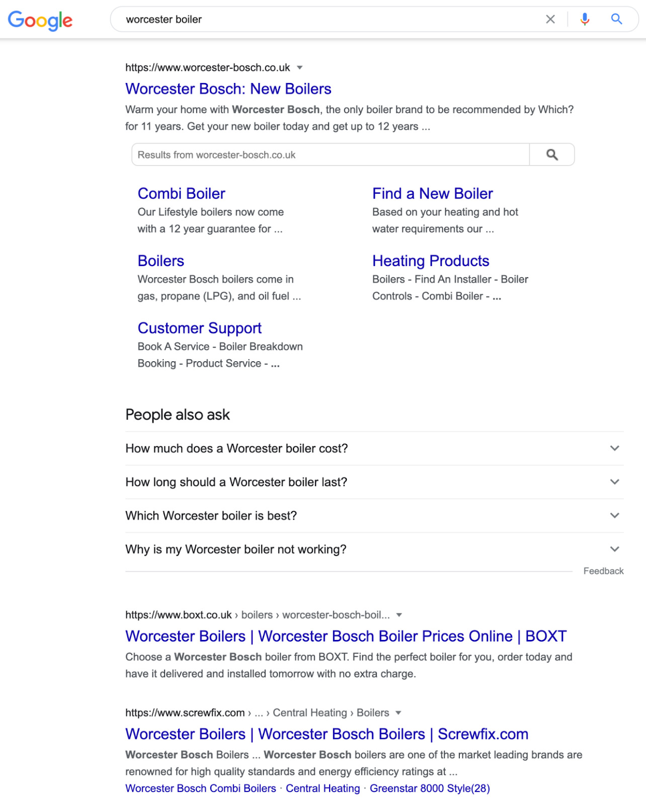 Ad esempio, le ricerche implicite per “caldaia worcester” non hanno un intento local—ma la versione esplicita (“caldaia worcester a nottingham” o in inglese “worcester boiler nottingham”) sì: