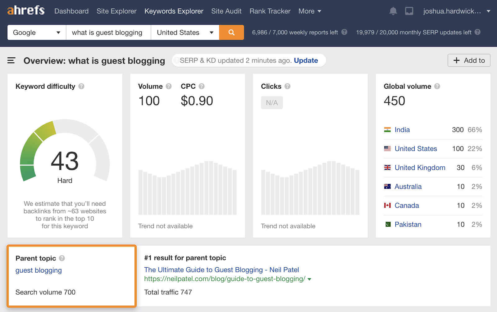 Ad esempio, il Parent Topic per la domanda “what is guest blogging” è “guest blogging”, che è lo stesso della parola chiave principale del nostro post: