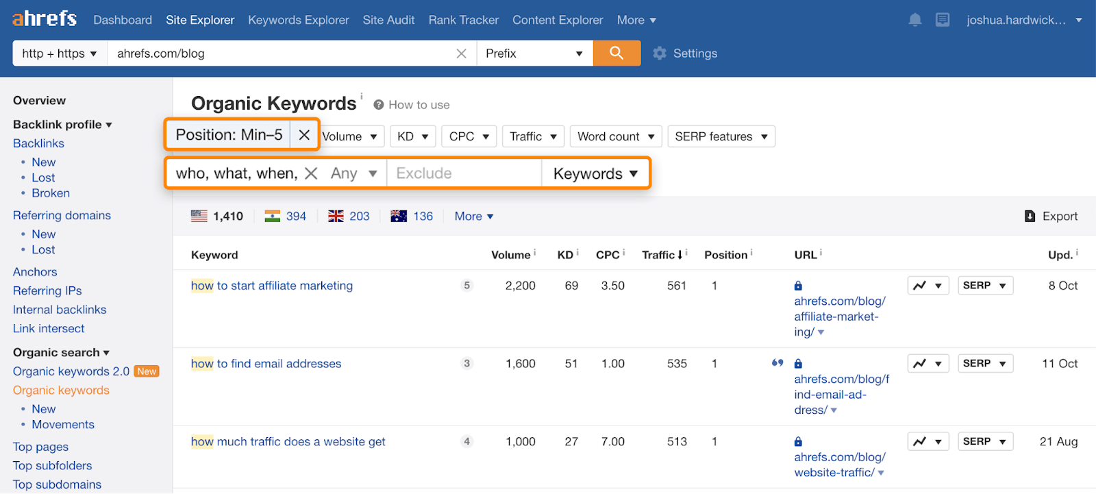 Site Explorer > inserisci il tuo dominio > Organic Keywords > filtra per posizioni fino alla quinta > filtra per parole chiave che contengono “come”, “perchè”, “quando”, “quanto”, ecc.