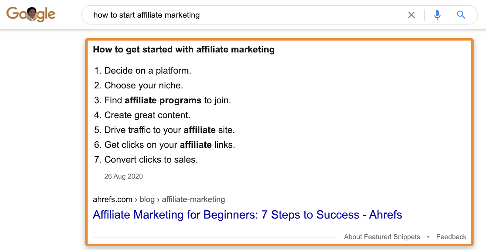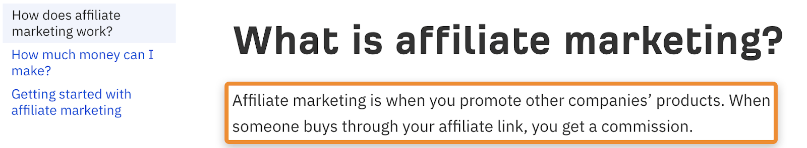 Se sei già posizionato per un specifica domanda, ci sono molte probabilità che hai risposto ad essa sulla pagina che si posiziona per tale ricerca. Questo è il motivo per il quale siamo posizionati (con tanti di featured snippet) per la domanda “how to start affiliate marketing”. La nostra guida all’affiliate marketing risponde alla domanda con una serie di step.