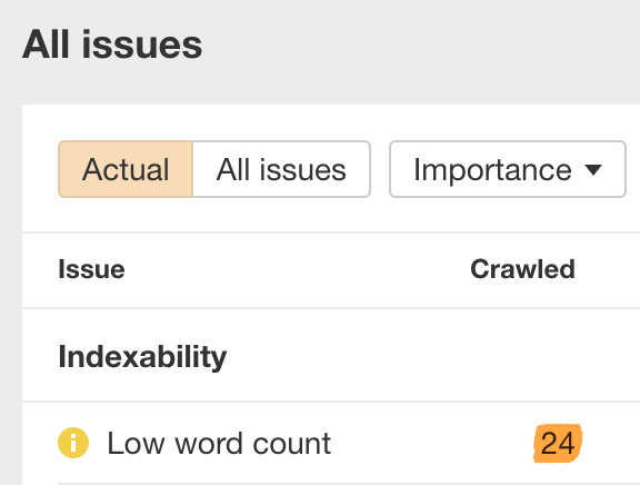 Puoi vedere una lista delle URL con un poco testo all’interno del report All issues.