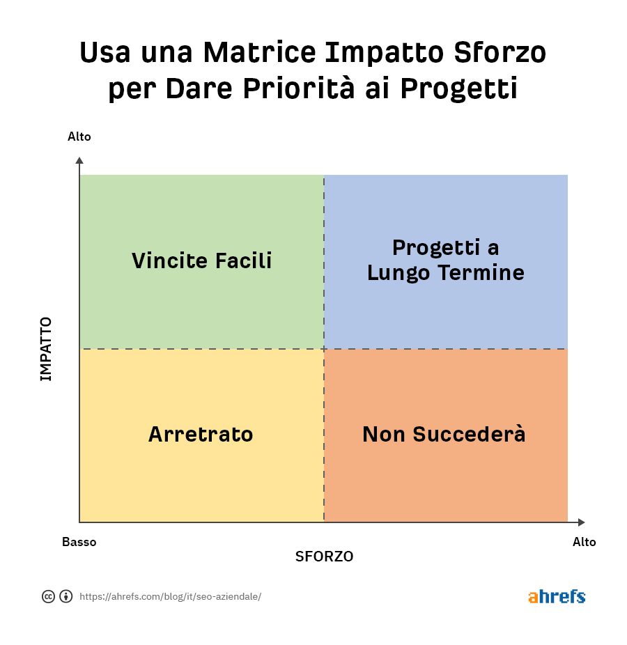 Potresti vedere diversi metodi di assegnazione delle priorità che involvono calcoli come Potential Importance Ease (PIE). Mi piace usare una Matrice Impact Effort come quella sotto perché è maggiormente visuale. Tutto ciò che ha un alto impatto e richiede poco impegno è una scelta da fare, quindi dai precedenza a queste attività. Cose come rivendicare link per il tuo sito web o aggiungere link interni probabilmente faranno parte di questa descrizione. La creazione di contenuti è di solito un progetto a lungo termine. Cose meno importanti vanno nel tuo backlog per quando avrai più tempo, e i progetti dove non riesci a giustificare le risorse perché chiedono molto impegno e sono di basso impatto non partiranno probabilmente mai.