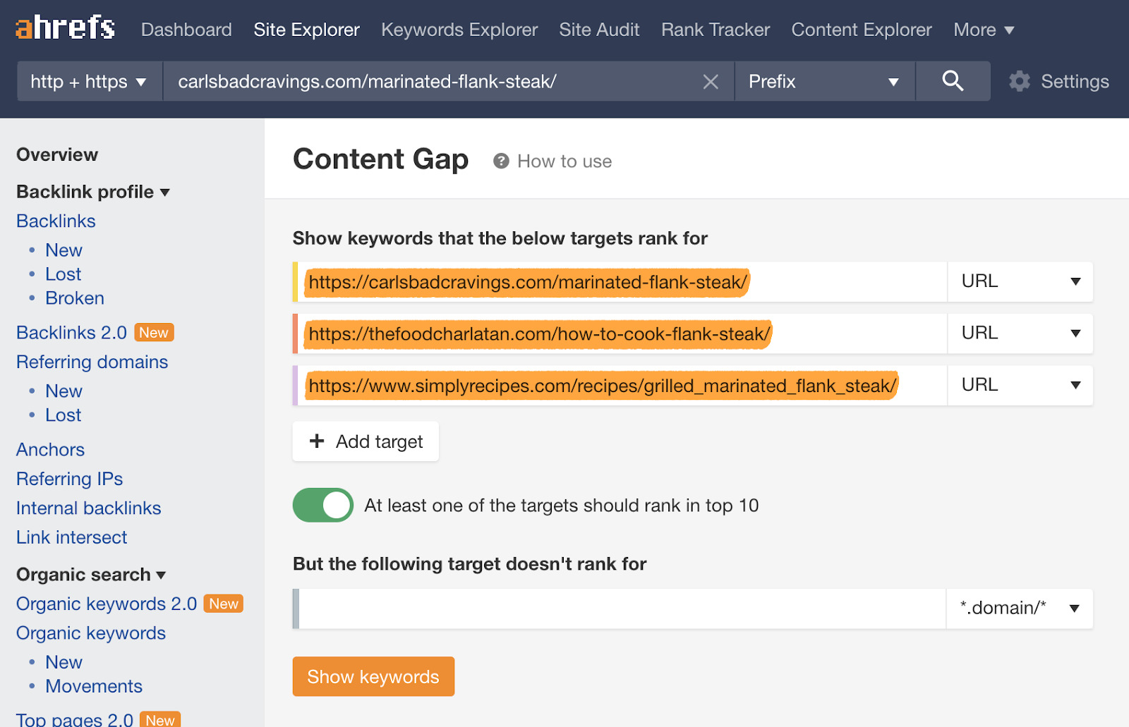 Inserisci alcune URL di pagine dei concorrenti nello strumento per il Content Gap di Ahrefs, imposta la modalità su URL e lascia il campo in fondo bianco.