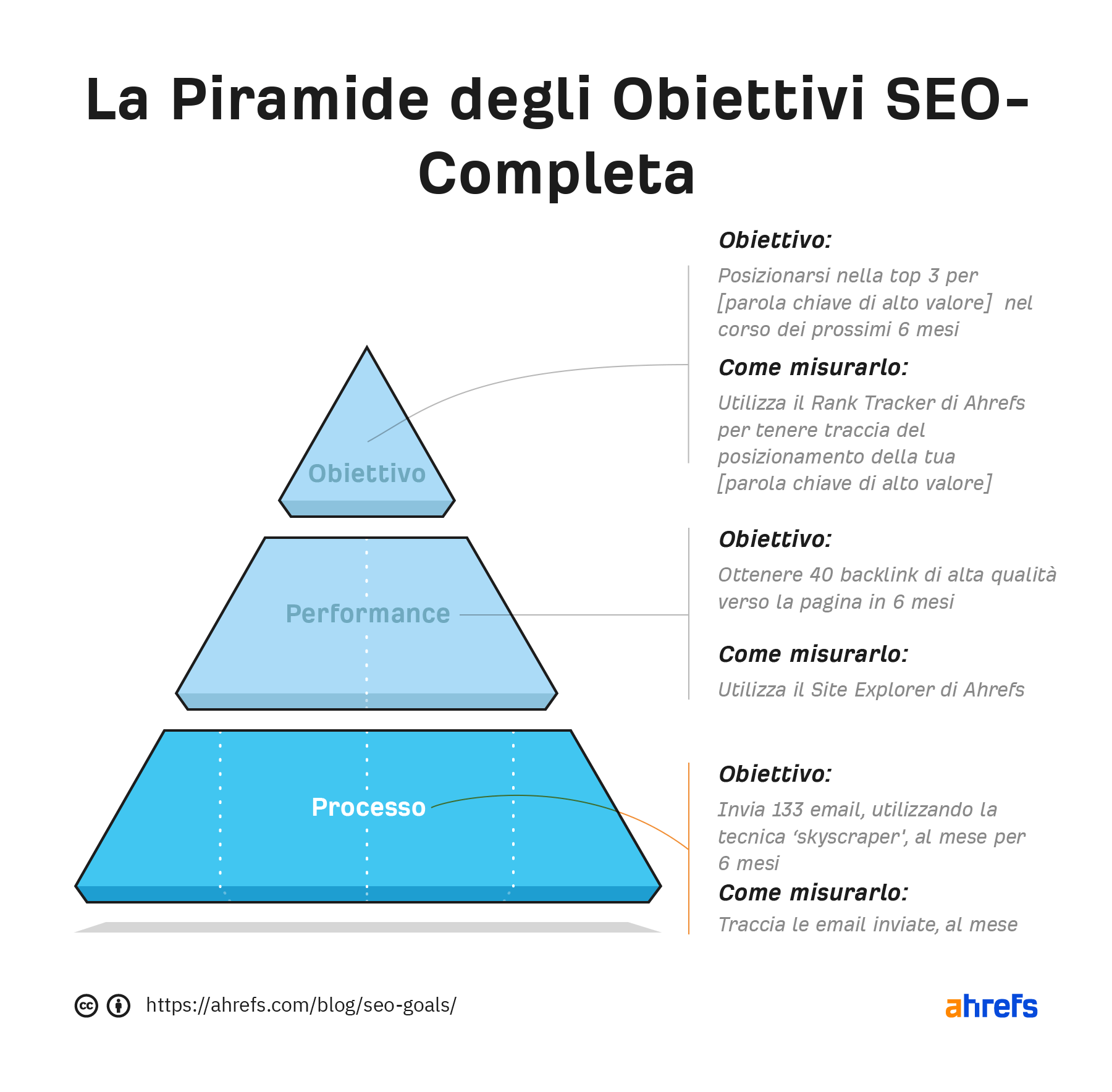 Ad esempio, poniamo caso che il tuo obiettivo sia quello di posizionarti in top tre per una determinata parola chiave in sei mesi. La piramide potrebbe essere un qualcosa del genere: