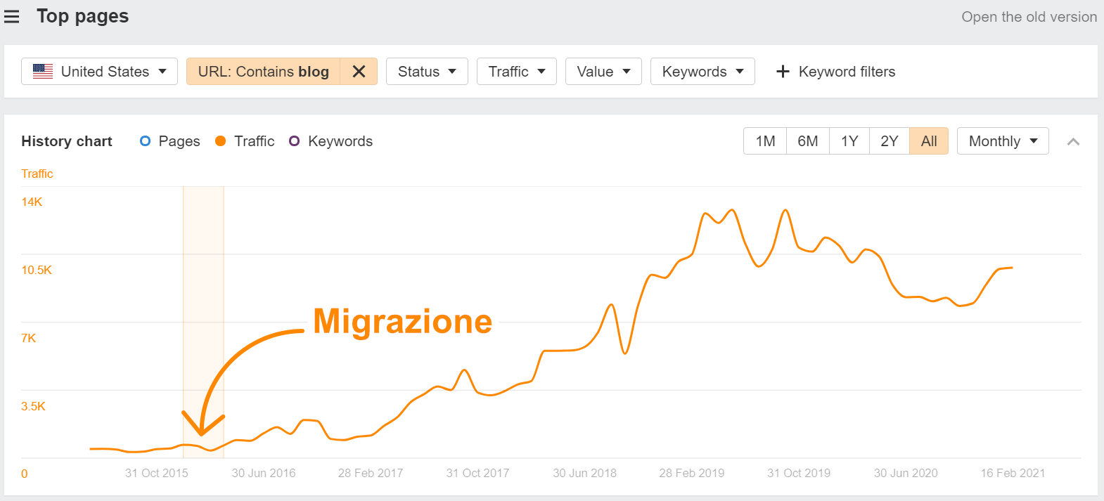 E nota anche come ogni pagina equivalente di un’altra pagina abbia perso traffico per poi recuperarne più o meno lo stesso ammontare. Il traffico si è semplicemente spostato verso la nuova URL, ma non ha subito un incremento.