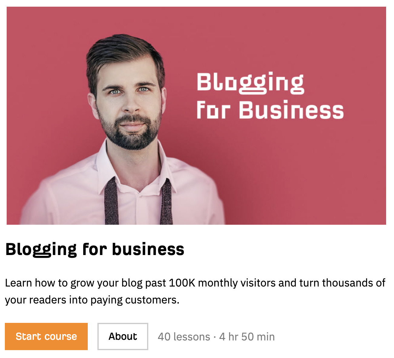 Ognuno di questi dura dalle due alle sette ore e offre un percorso strutturato per imparare una particolare abilità. Ad esempio, il nostro corso Blogging for Business insegna come portare il tuo blog a oltre 100K visitatori organici mensili e trasformare migliaia di lettori in clienti paganti.