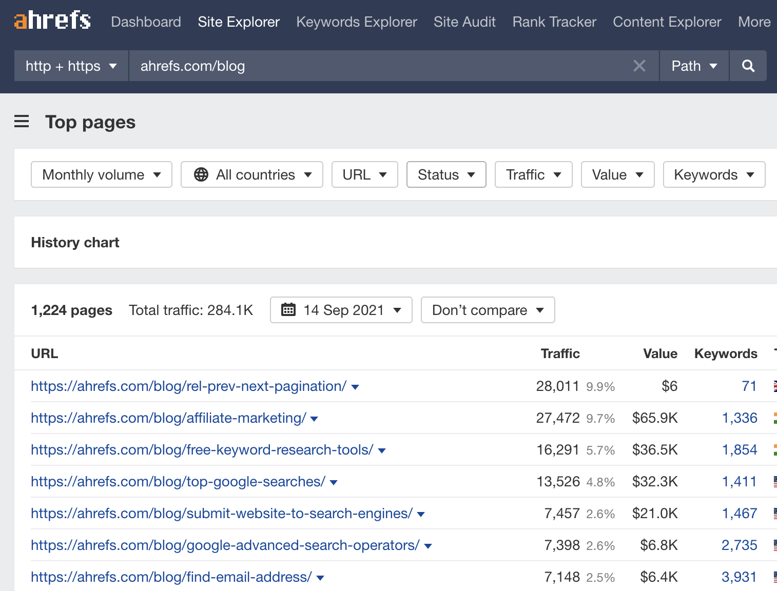 Utilizza Google Analytics per vedere i contenuti più visualizzati. Se non utilizzi Google Analytics, puoi sfruttare il report Top pages all’interno del Site Explorer per farti un’idea: