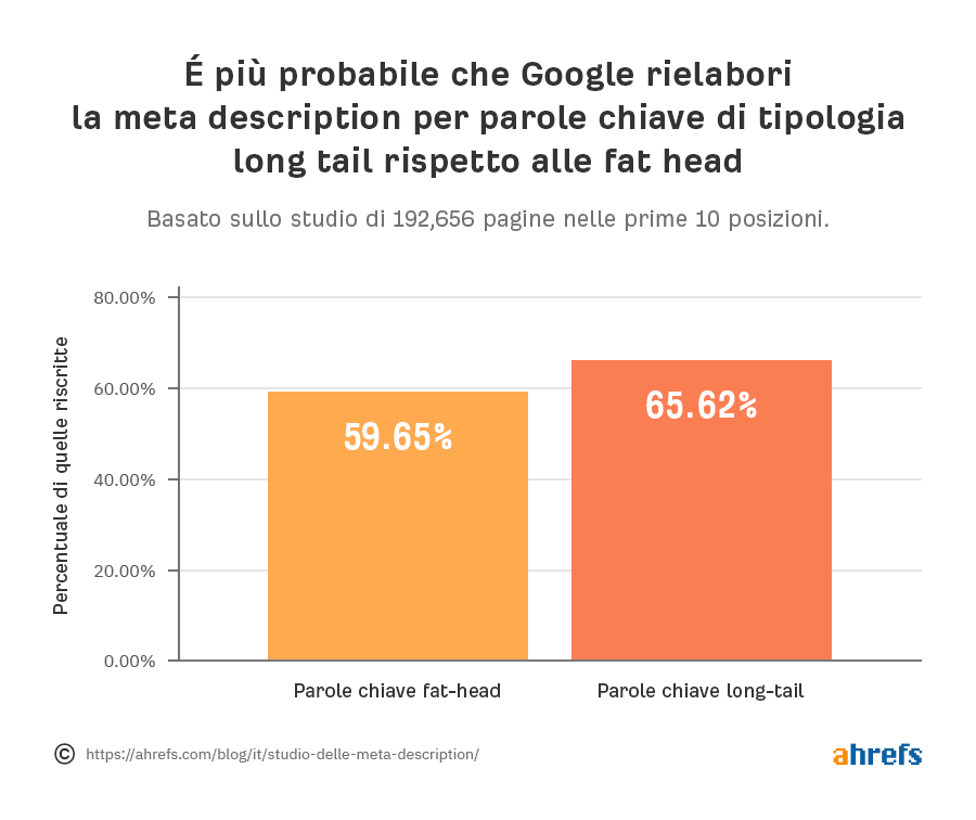 Anche se è vero che ci sono più probabilità che Google riscriva la meta description per le parole chiave long-tail rispetto a quelle fat-head, la differenza non è sostanziale.