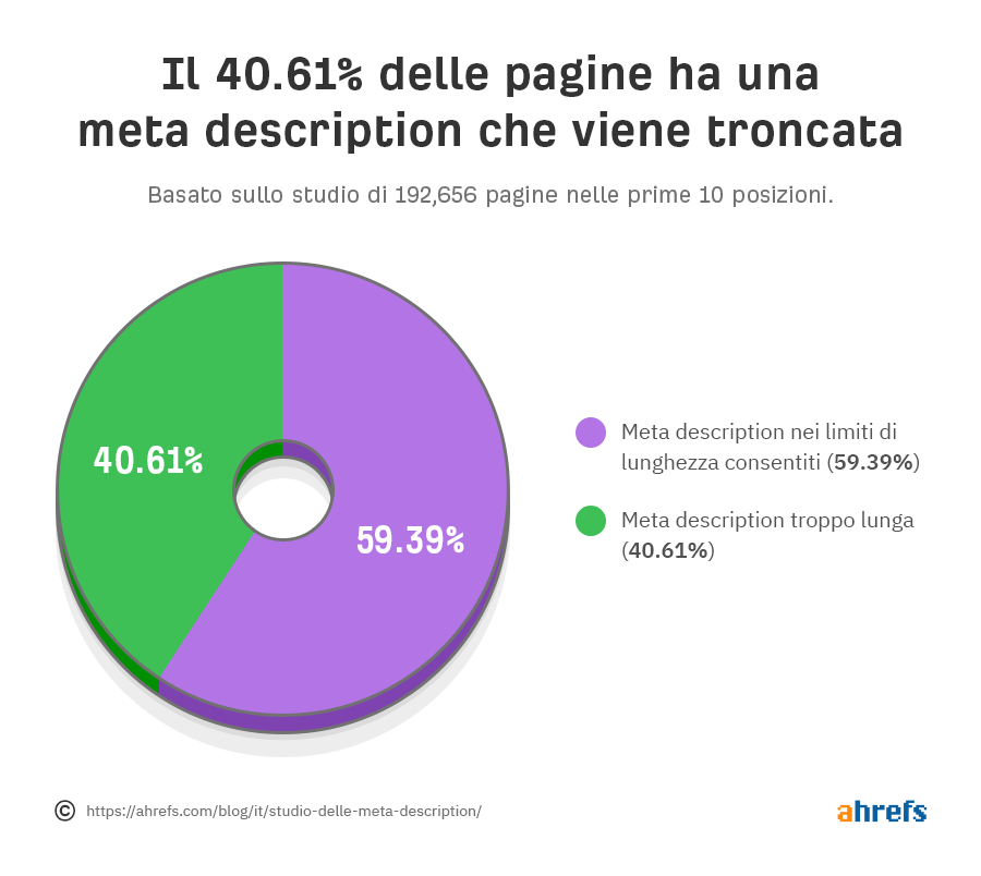 Probabilmente questo dipende dal fatto che le meta description troppo lunghe sono particolarmente comuni. Il 40.61% delle description presenti sulle 192,656 pagine analizzate per questo studio erano infatti eccessivamente lunghe.