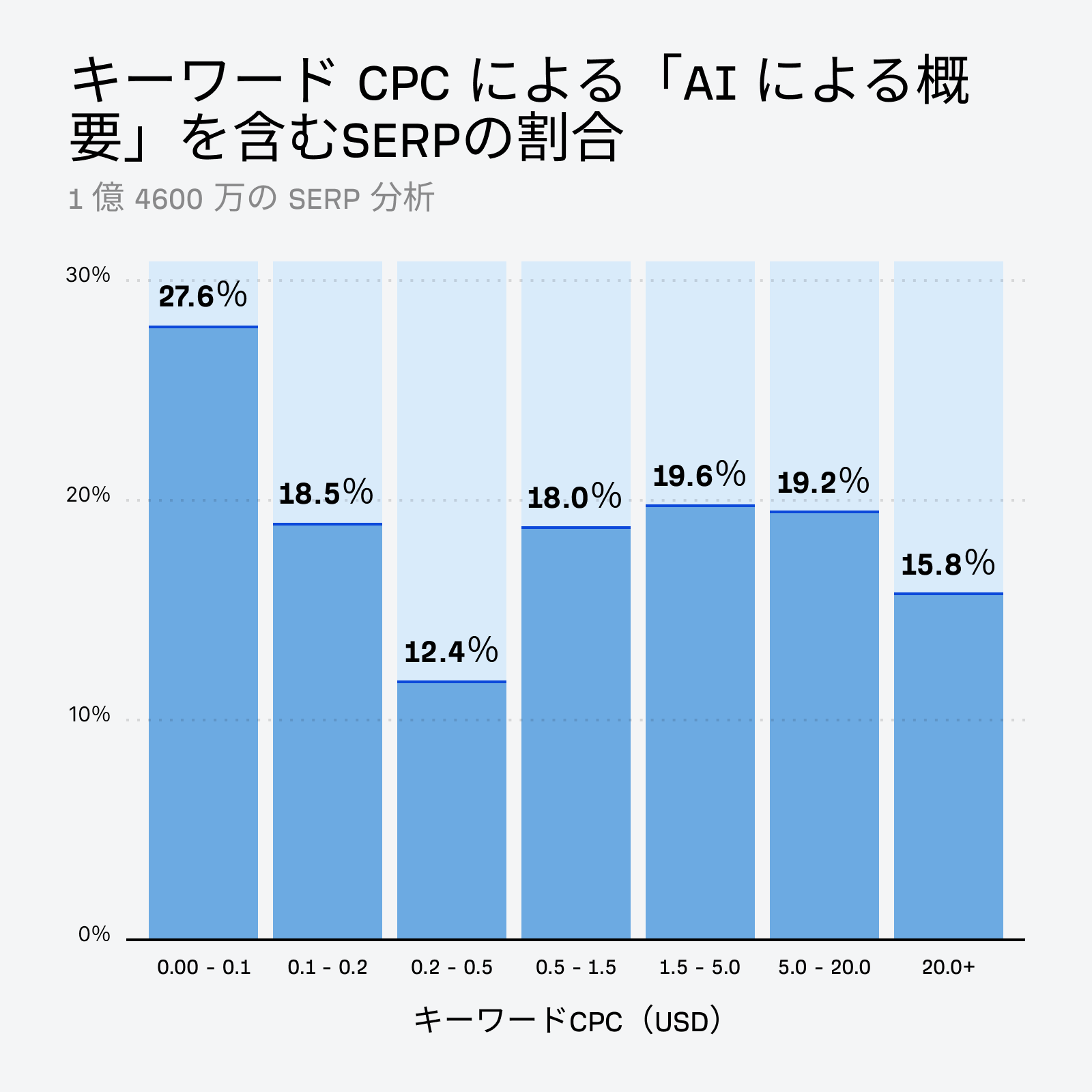 キーワードの CPC(クリック単価)と AI Overviews の表示率との間には、明確な相関関係はほとんど見られません。表示率はどのCPC 帯でも、基準値の 20.5% 付近に収まっています。