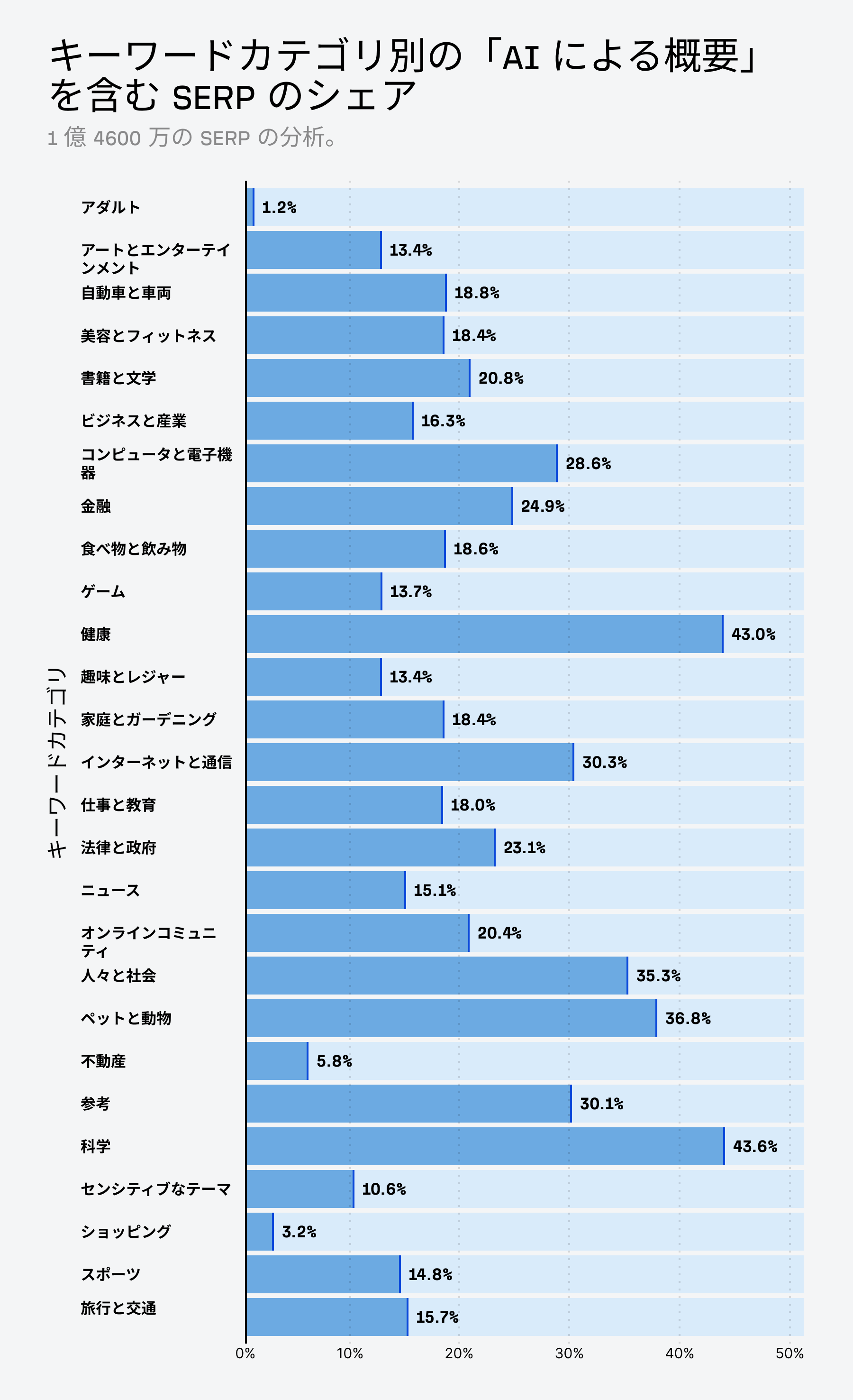 - AI Overviews のシェアが最も高いカテゴリは、科学(43.6%)、医療・健康(43.0%)、ペット・動物(36.8%)、人・社会(35.3%)である。