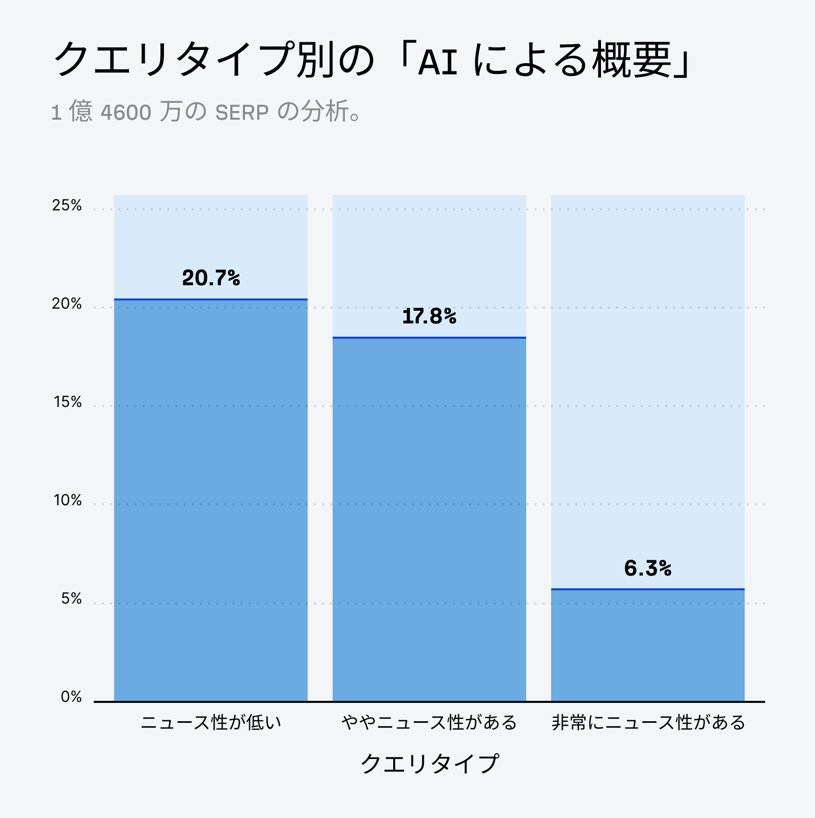 - ニュース系クエリのわずか 6% しか AI Overviews の表示につながっていない。