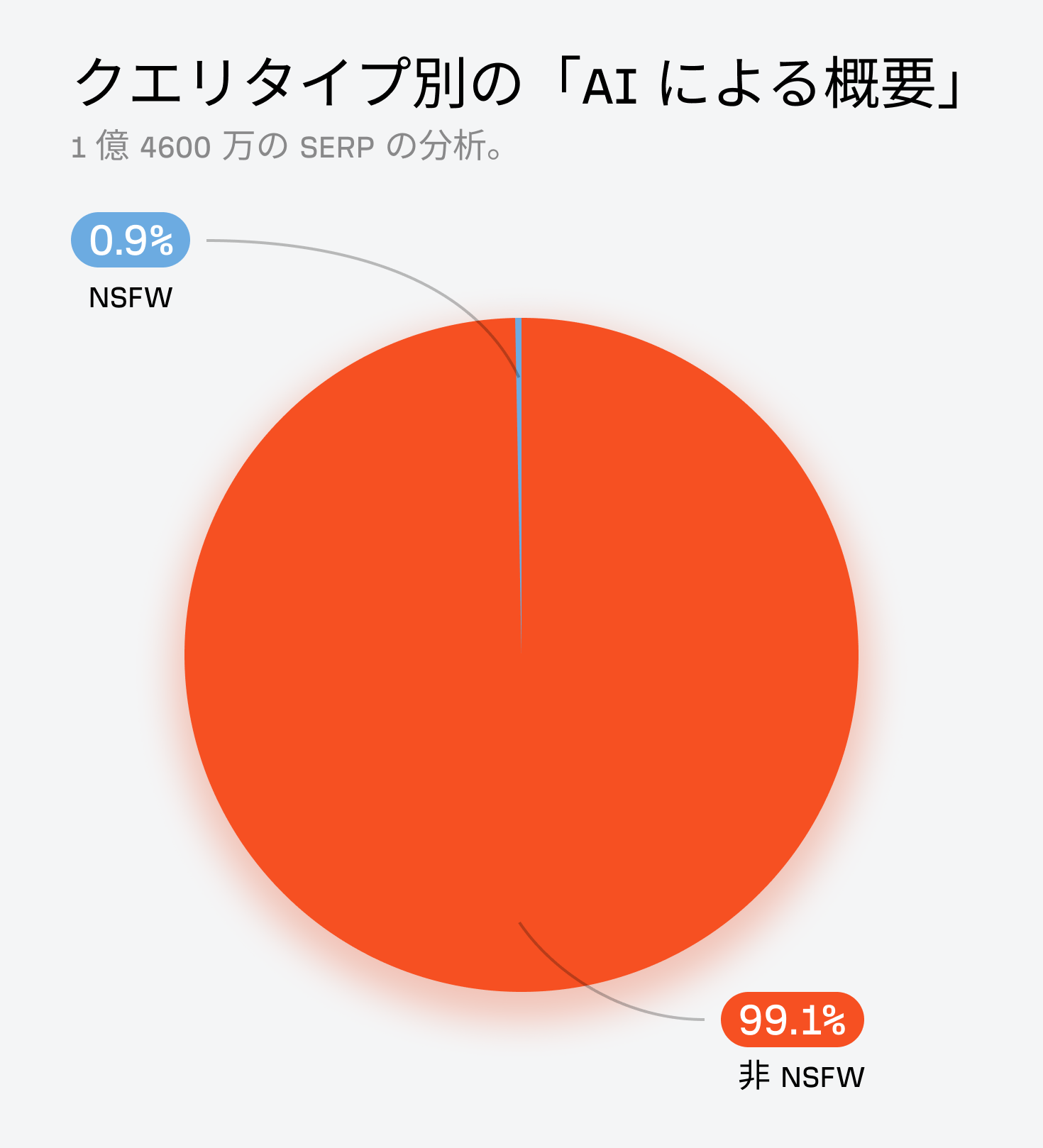 基本的に AI Overviews は、職場での閲覧に不適切な(NSFW)クエリではほとんど表示されません。AI Overviews が表示されるクエリのうち、99.1% は NSFW ではないクエリとして分類されています。