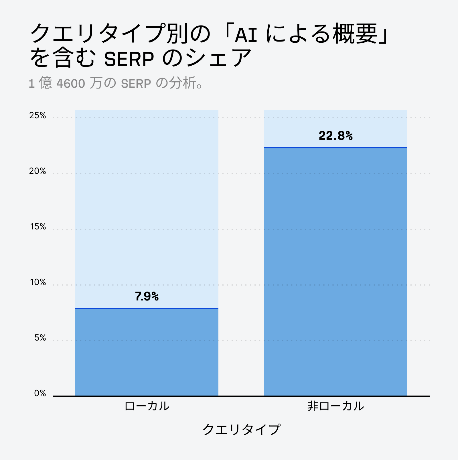 ローカル検索として分類されるクエリで AI Overviews が表示されるのはわずか 7.9% で、全キーワードの基準値である 20.5% を大きく下回っています。一方、非ローカル検索では 22.8% と、基準値をわずかに上回る結果となりました。