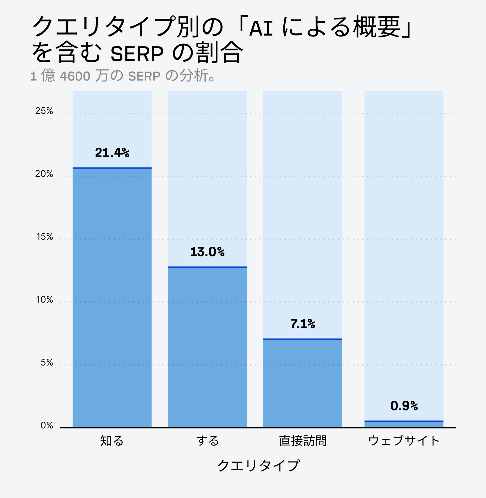 Do、Visit-in-person、Website の各クエリタイプは、いずれも基準値より低い頻度で AI Overviews を表示しています。特に Website クエリでは、AI Overviews が表示されるのは 1% 未満と、ごくわずかです。