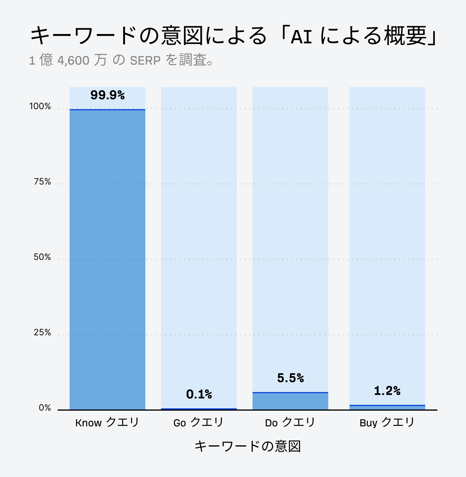 - AI Overviews の 99.9% は「情報収集型(Informational)」の検索意図(インテント)を持つキーワードで表示される。