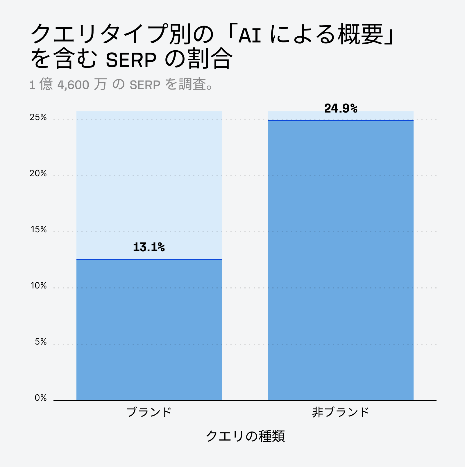 AI Overviews は非ブランドクエリで表示される可能性が 1.9 倍高く、当社の SERP データベースでは、ブランド系クエリの 13.1% に対して、非ブランド系クエリでは 24.9% に AI Overviews が表示されていました。