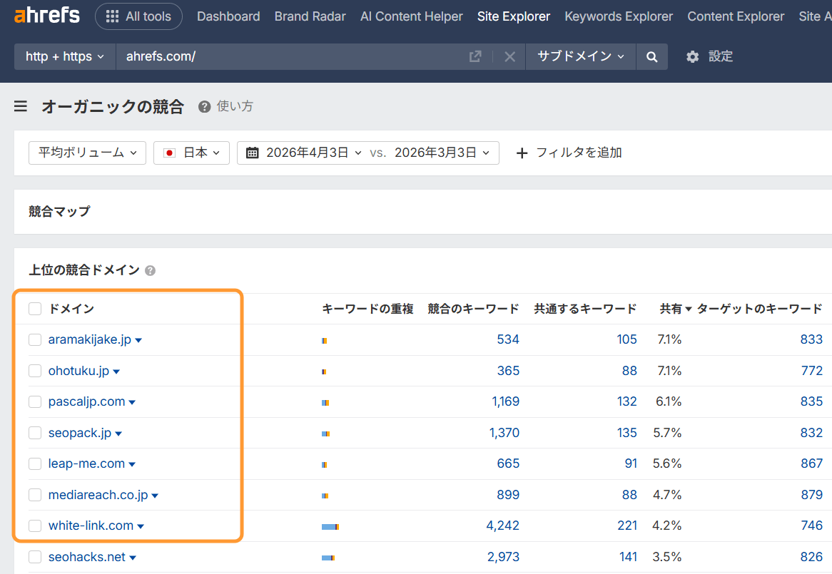 もし「誰をベンチマークすべきか迷っている」なら、サイトエクスプローラーのオーガニックの競合レポートを覗いてみてください。キーワードの重なり具合から、検索結果で競合している「真のライバル」を AI が自動でリストアップしてくれます。