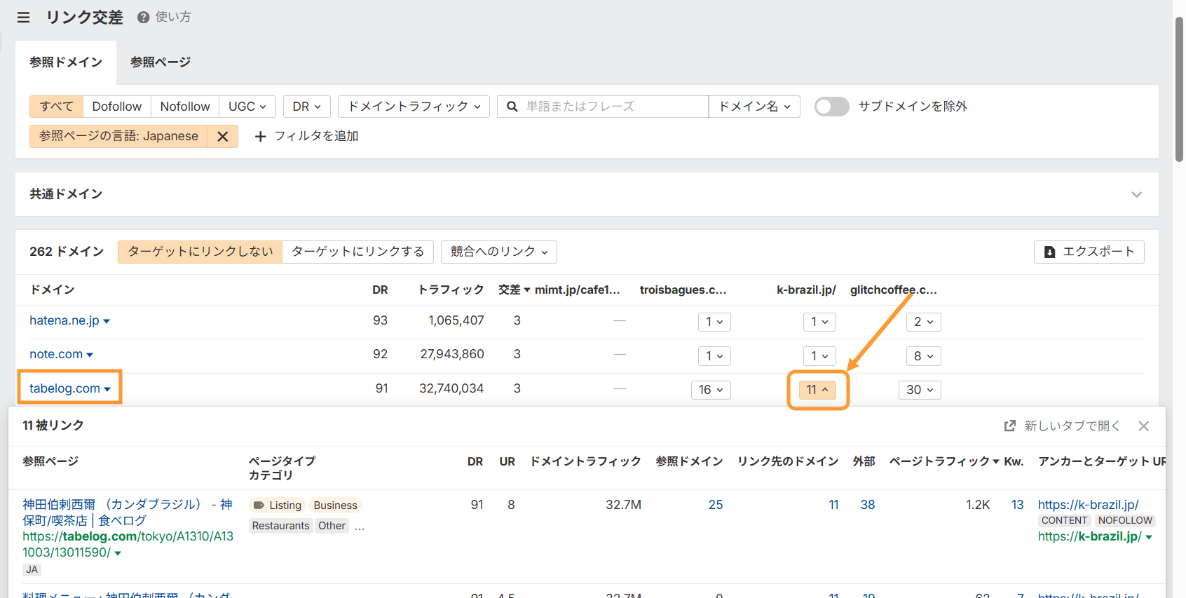フィルタ機能を駆使して「トラフィックのあるサイト」や「日本語のページ」だけに絞り込むことで、本当に参考にすべきリンクを浮き彫りにできます。