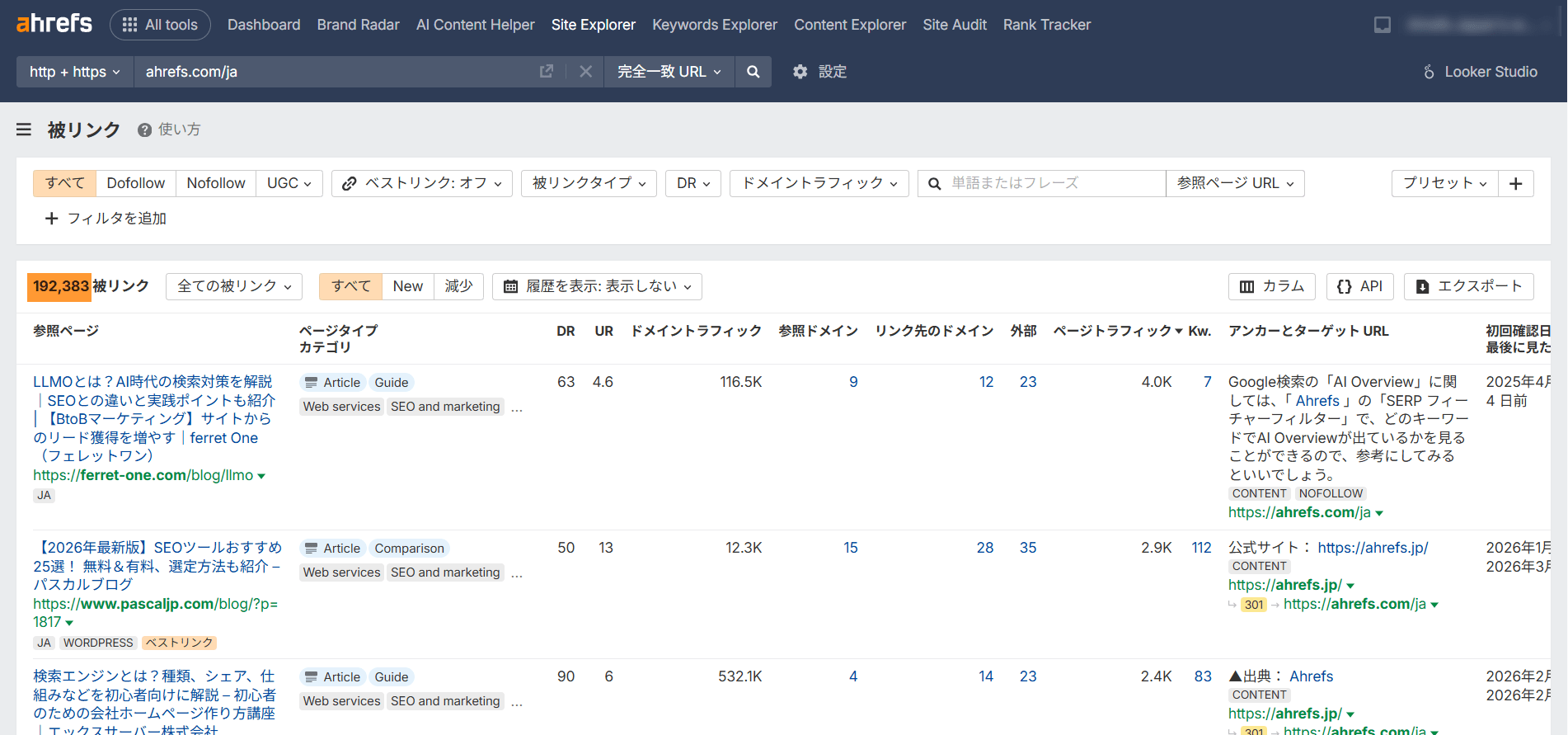すべてのリンクを詳細に分析: 有料版のサイトエクスプローラーでは、数万、数十万にのぼるすべての被リンクを網羅。今回の検索では、なんと 190,000 件を超えるバックリンクを獲得していることが分かりました。