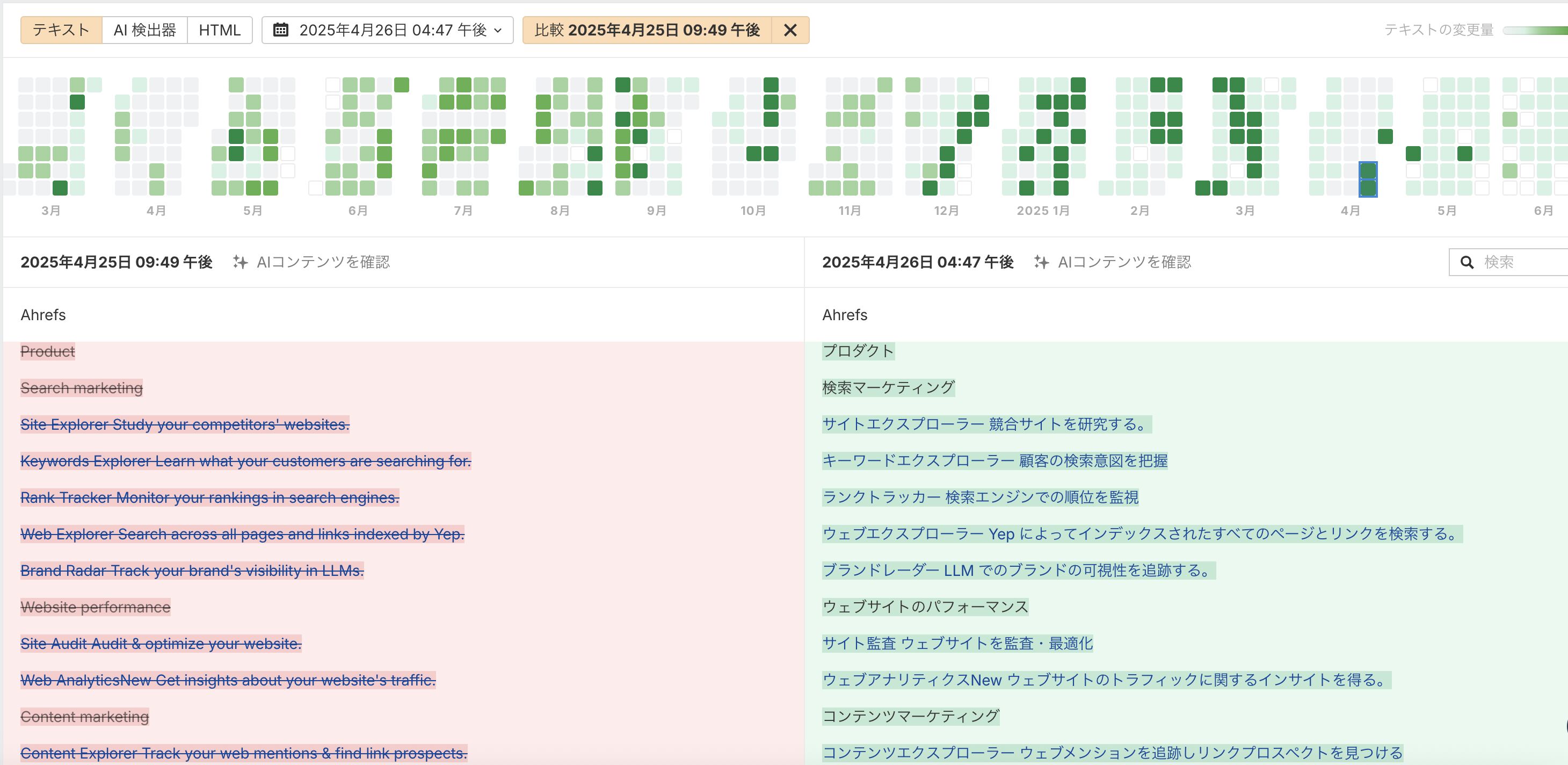 浅井氏:「記事を作成する際、上位サイトがどのようなキーワードで評価されているかを Ahrefs で取得し、それらのキーワードを記事に含めるフローを確立しています。さらに、リライトの質を高めるために、ページ検査機能も活用します。この機能を使うと、競合サイトのページの変更履歴が見られるんです。他社が『こういう点をこういう風に書き換えているから評価が上がっているんだ』という改善のヒントが見つけやすく、非常に重宝しています。」