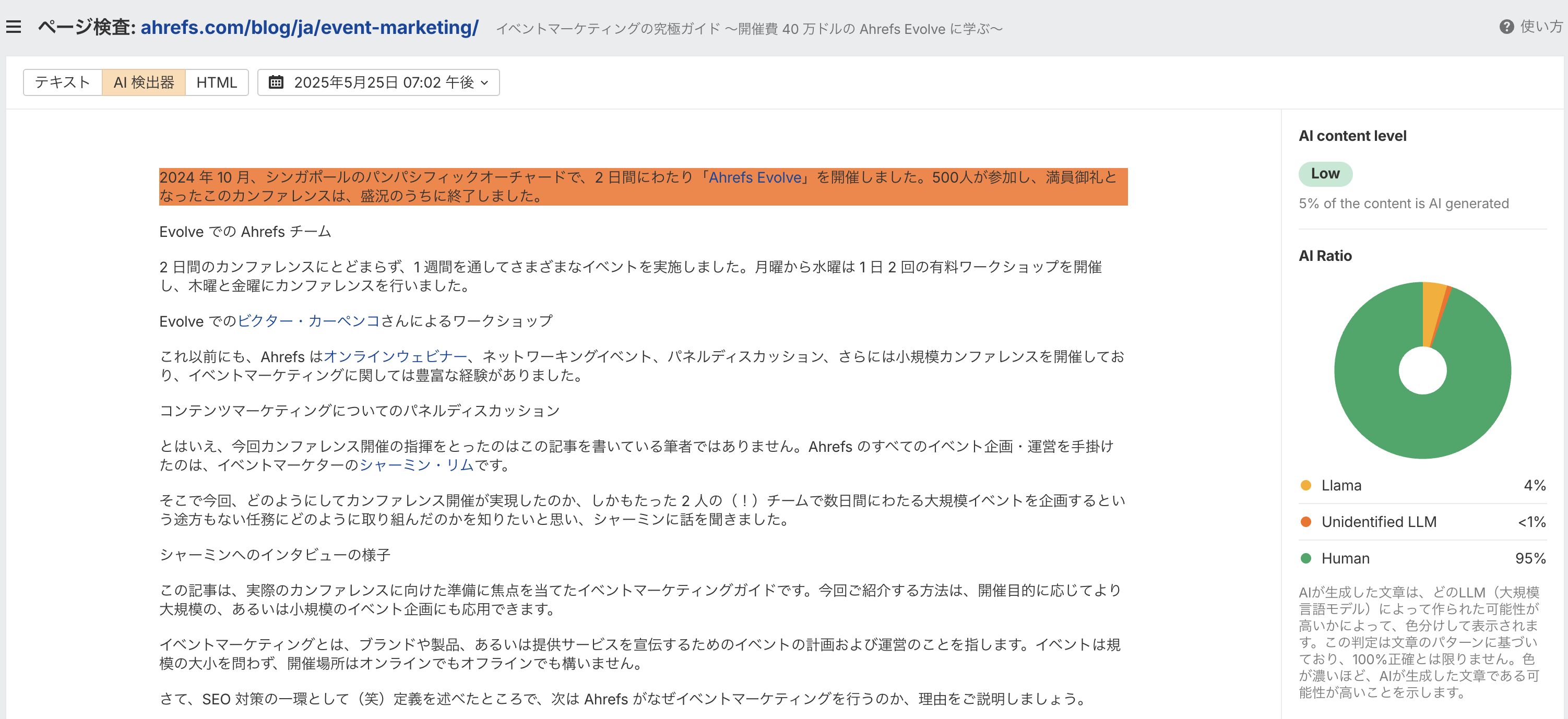 浅井氏:「最近の機能アップデートは素晴らしいですね。例えば AI コンテンツディテクター。お客様のコンテンツが『AI っぽい』と感じた際に、このツールで分析した結果を客観的な根拠としてお見せできるので、改善提案がしやすくなりました。」