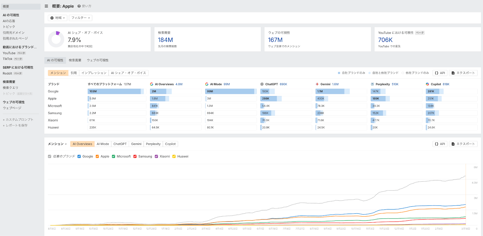 LLMO 面では、導入当初から AI に強い関心を持っていたクライアントの要望に応え、ブランドレーダーでブランドのメンション数・引用数を計測。競合との比較分析や、ターゲットプロンプトの登録によるモニタリングをスタートさせています。