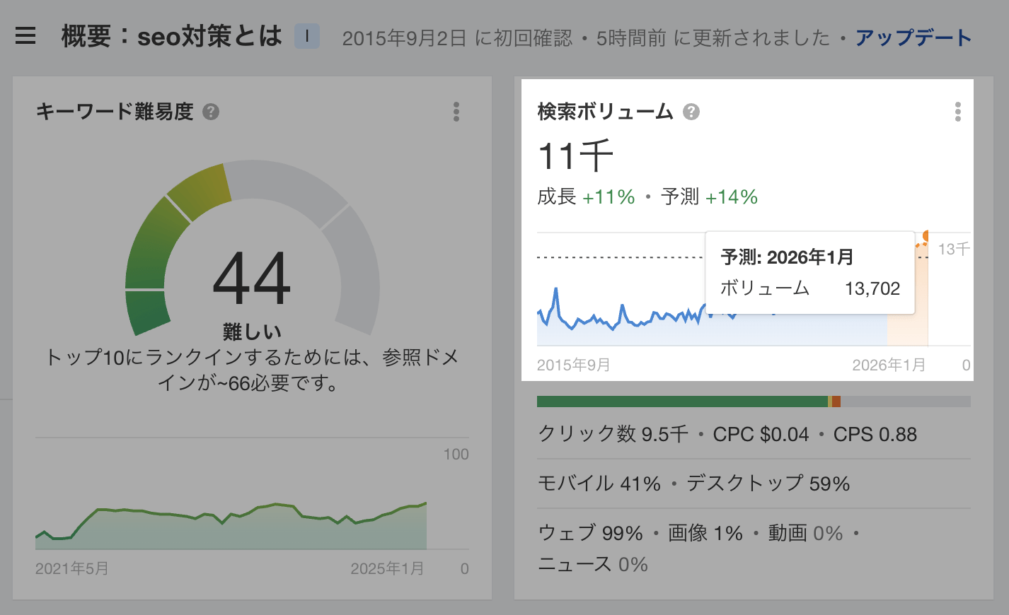 12ヶ月間の検索ボリューム成長予測を用いて、キーワードの将来的なトレンドを予測し、有望な機会に集中できます。
