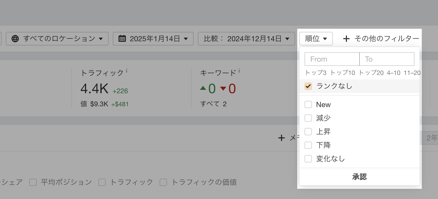 Overview 2.0 に新たに追加された「No rank filter」を使えば、ターゲットサイトが現在ランキングしていないキーワードを簡単に見つけることができます。