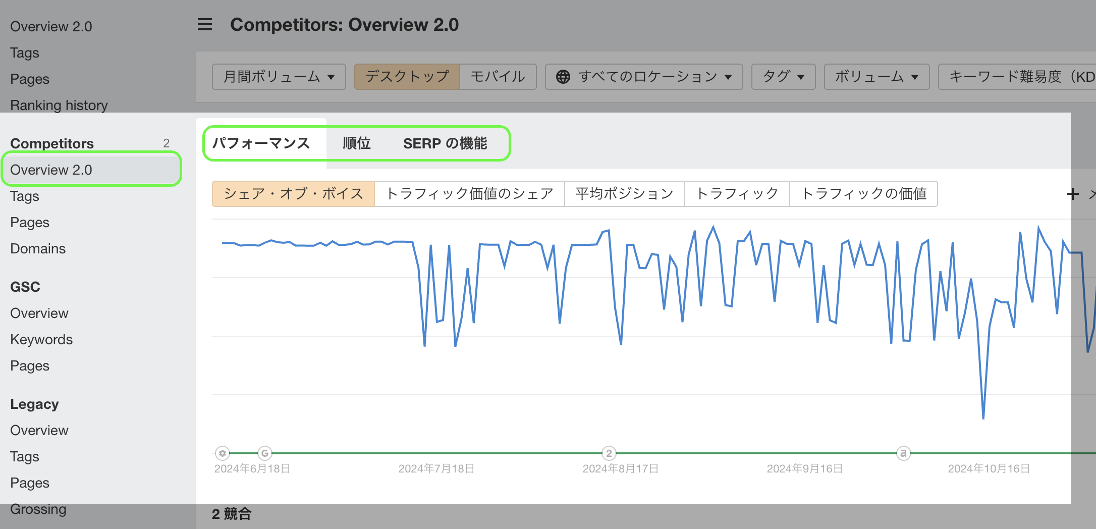 ランクトラッカーの Competitors Overview に新たに加わった履歴チャートを活用し、以下のデータを可視化: